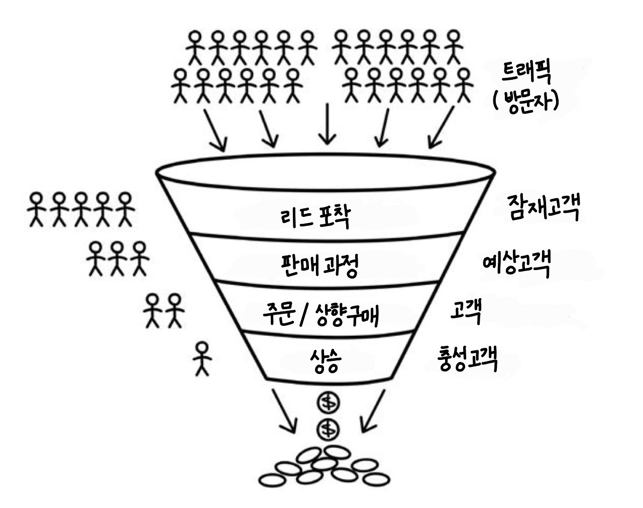 길거리 영업사원이 내미는 전단지를 받았다고 해서 당신의 사업 가치가 수직 상승한 적이 있는가? 높은 확률로 없을 것이다. 그 모든 이유는 앞서 언급했던 한 문장에 담겨있다. 나의 ‘고객’, 나의 ‘가치’, 결정적으로 일련의 ‘전략적인’ 퍼널이 없다. 내가 판매하는 제품을 필요로 하지 않는(잠재고객이 아닌) 사람에게 ‘비록 당신에게 이 제품이 필요하진 않지만 일단은 구매하라’고 속삭이는 것과 같다. 판매는커녕 얼마큼의 가치가 있는지 들여다보는 노력조차 하지 않을 것이다. 당신의 사업에 명확한 ‘퍼널’이 존재한다면 당신이 겨냥한 예상 고객은 (주)ㅇㅇ 영업사원이 제안하는 전략을 ‘구매’하여 당신의 사업 가치를 대폭 상승시킬 것이다.