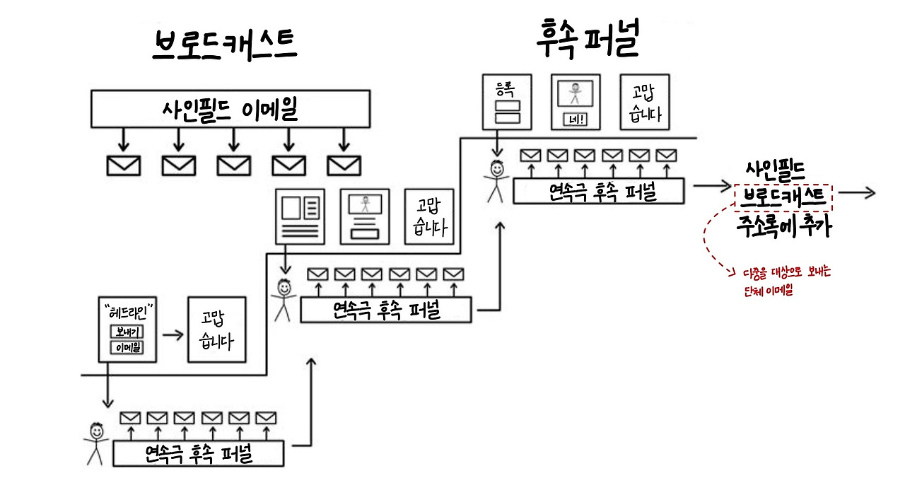 후속 퍼널에 들어와 있지 않은 잠재고객들을 다시 불러들여 가치 사다리로 되돌려 보낼 충격 실화를 공개하라. 모든 이메일에는 '후크','스토리', '제안'으로 이루어져야 하며, 주제가 광범위할수록 소재가 고갈되는 일이 없다는 점에 유의하라.