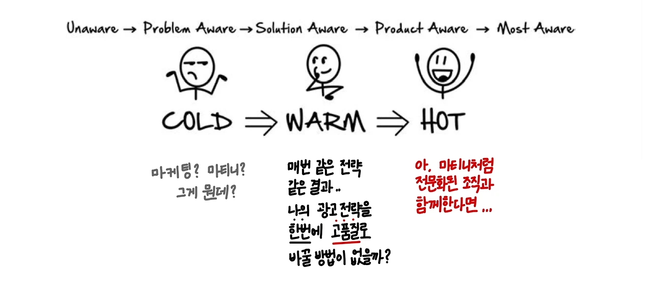 계약이 만료된 시점에 다시 협력할 업체를 찾기 위해 구글링을 했다. 그러다 엠제(emje)의 ‘그로스 마케팅과 그로스해킹은 뭐가 다를까?’란 브런치를 읽게 되었다. 마케팅은 알겠는데 그로스? 해킹? 도대체 무슨 말인가 해서 의식의 흐름대로 읽어 내려가다 글의 끝맺음에 다달았을 때 ‘이거다!’ 싶었다. 정확히는 모르겠지만 단순히 많은 비용을 써야만 광고 효과를 볼 수 있을 거라는 타 대행사와는 다르다는 것쯤은 알 수 있었다. 나는 당장 곧 있을 마티니아이오의 세션에 비용 5만 원을 지불하여 참가했다. 그들은 Performance & Growth & CRM을 원스톱 솔루션으로 제공한다는 사실과 이에 대한 3W(Why, What, When)을 설명했고 나는 완벽히 설득당했다. 그리고 세션이 끝난 동시에 마티니아이오에 컨설팅을 의뢰했다.