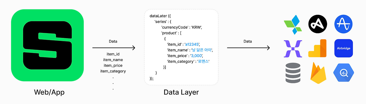 서비스마다 사용하는 분석 도구(analytics tool)와 데이터 구조가 저마다 상이하기 때문에 이를 먼저 파악해야 합니다. 일반적으로 타사(구글 애널리틱스, MMP 등) 애널리틱스를 사용하거나, 자사 자체 구축 애널리틱스를 사용하는 경우로 나뉘는데, 두 가지를 병용하는 경우도 다분합니다. 예를 들어, 자사 애널리틱스의 로그 이용 시 경로 추적에 한계가 있기 때문에 이에 최적화되어 있는 GA4와 병용하는 경우를 흔히 볼 수 있습니다. *GA4와 GTM을 사용한다면 [구글 애널리틱스] 데이터 레이어 (Data Layer) 총 정리 (1) 내용을 참고 바랍니다.