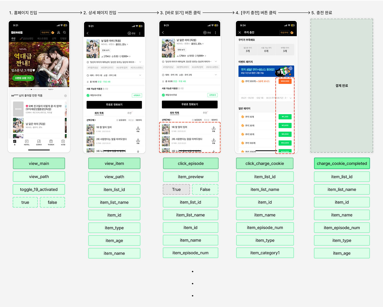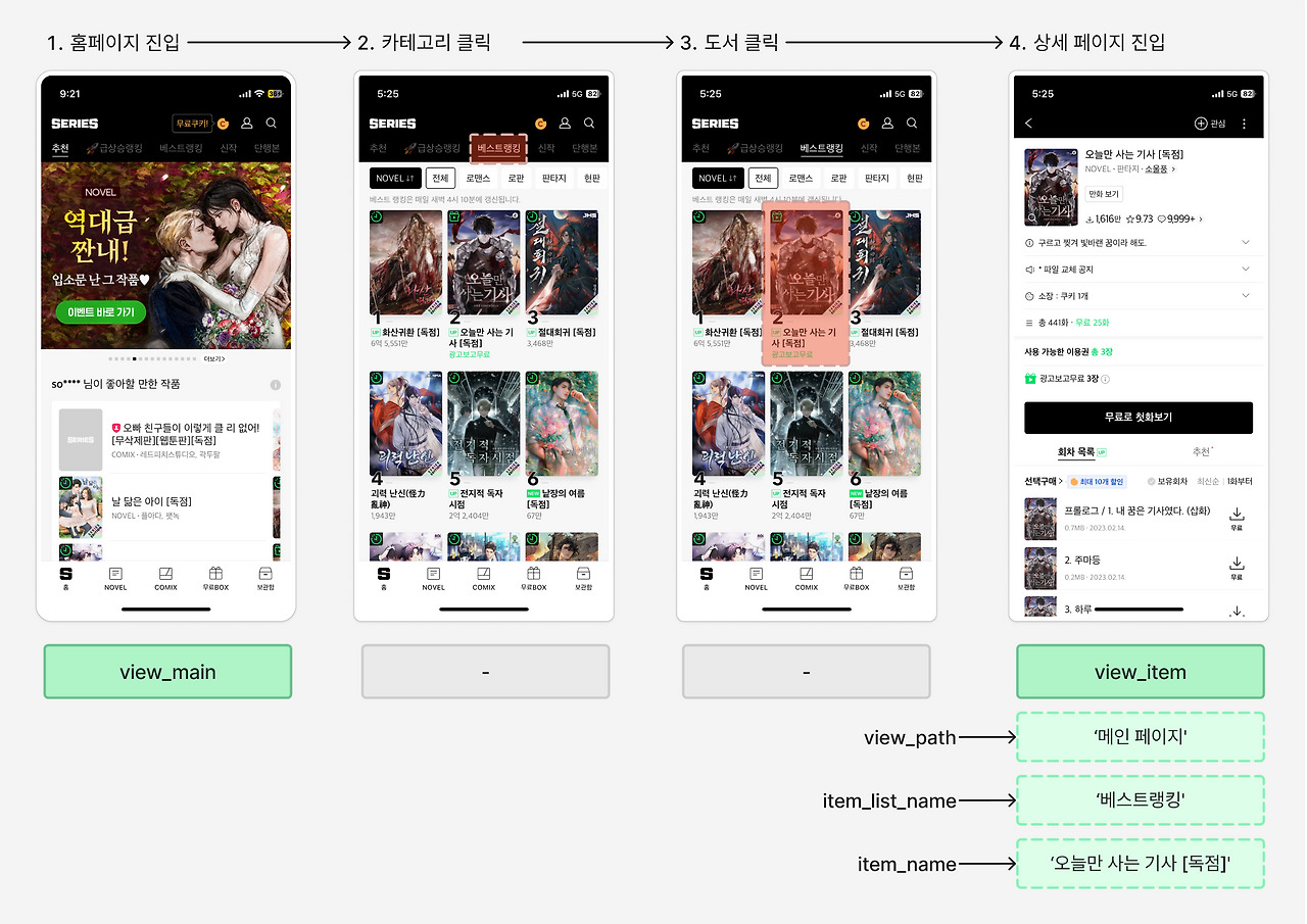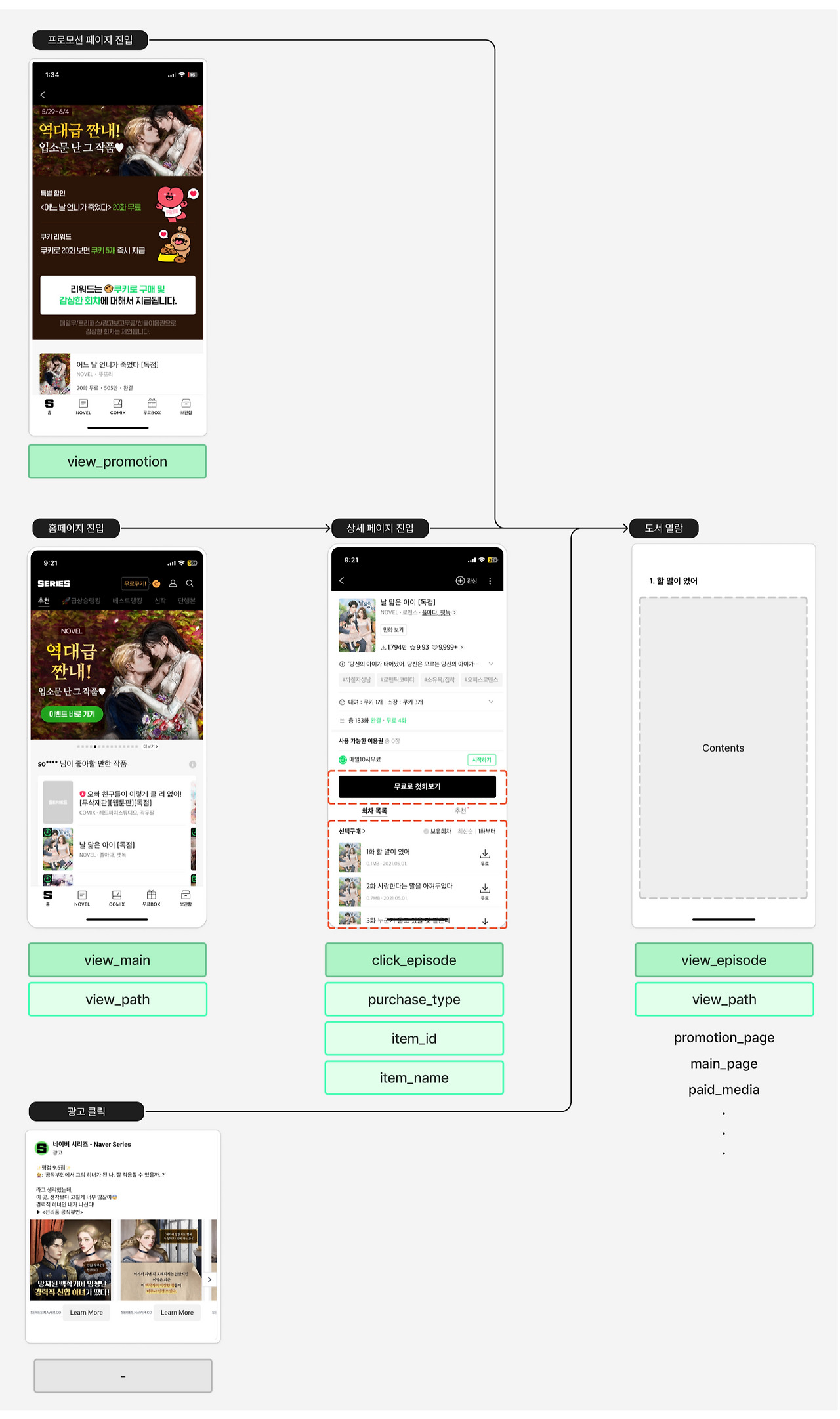 네이버 시리즈의 도서 상세 페이지의 경우 view와 click이 동시에 필요합니다. 예를 들어 특정 도서의 상세 페이지 내에 '무료로 첫화보기' 혹은 '다음화 이어보기' 등의 버튼과 같이 결정적인 클릭 요소가 있는 동시에 신작 홍보 이벤트나 기간 한정 프로모션을 통한 유입 경로가 다양할 수 있습니다. 이러한 경우가 '조회'와 '클릭'을 동시 추적해야 하는 경우라고 볼 수 있습니다.