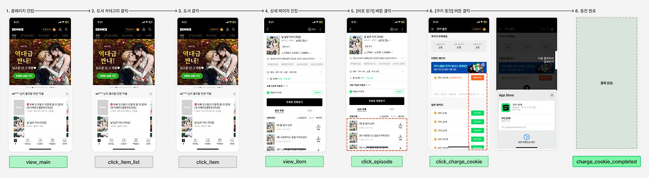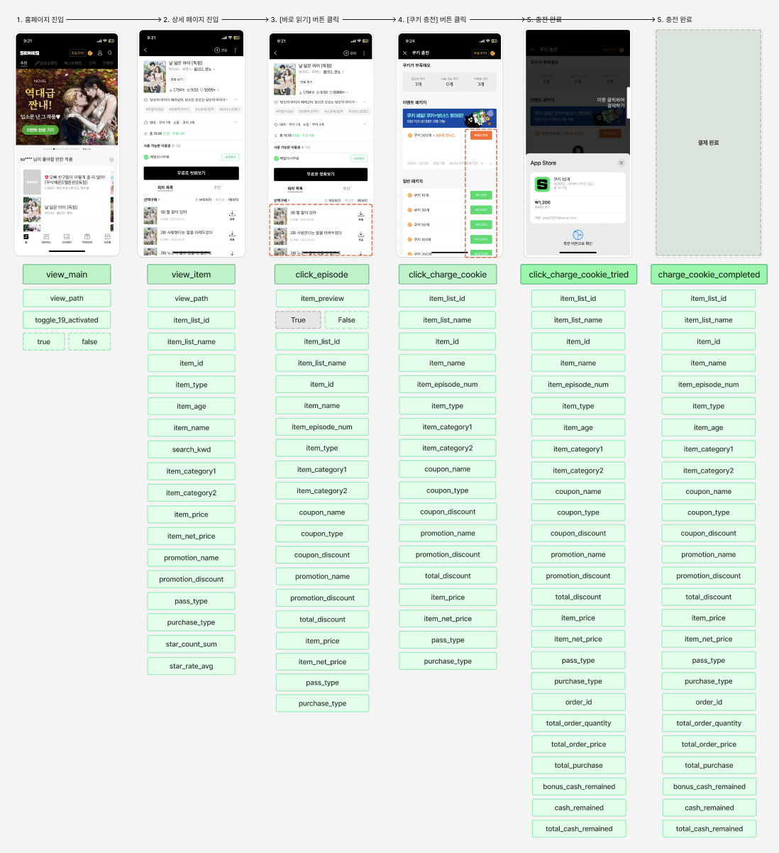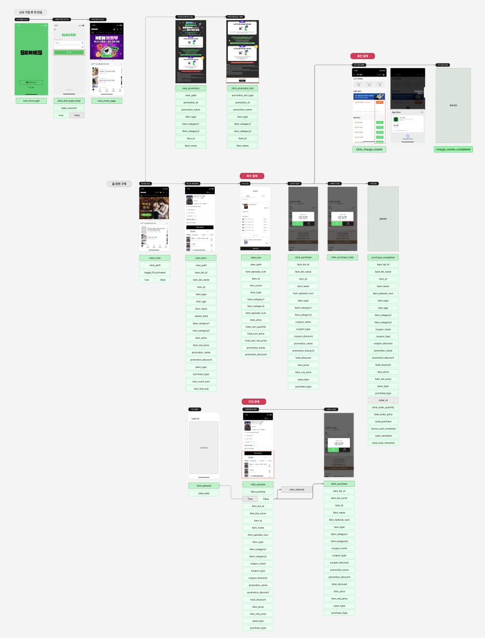 네이버 시리즈의 도서 상세 페이지의 경우 view와 click이 동시에 필요합니다. 예를 들어 특정 도서의 상세 페이지 내에 '무료로 첫화보기' 혹은 '다음화 이어보기' 등의 버튼과 같이 결정적인 클릭 요소가 있는 동시에 신작 홍보 이벤트나 기간 한정 프로모션을 통한 유입 경로가 다양할 수 있습니다. 이러한 경우가 '조회'와 '클릭'을 동시 추적해야 하는 경우라고 볼 수 있습니다.