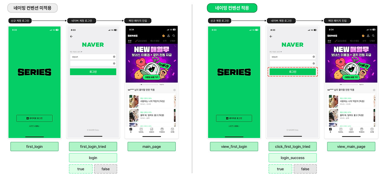 좌측의 네이밍 컨벤션을 적용하지 않은 경우 'first_login'이 '로그인 페이지 조회'인지, 페이지 내의 '로그인 버튼 클릭'인지 구별이 어렵습니다. 반면 우측의 네이밍 컨벤션을 적용한 경우 가장 앞단에 행동 조건(trigger)과 이벤트명, 그리고 추가 정보까지 규칙적으로 정의되어 있어 비교적 구별하기가 수월합니다.