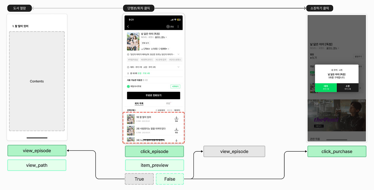 아래는 특정 도서의 상세 페이지에서 '무료' 전환과 '유료' 전환을 프로퍼티로 나눈 예시입니다. 사용자가 'click_episode'를 발생시킬 시 'item_preview'가 True(무료 회차)인 경우 즉시 도서 열람 페이지로, False(유료 회차)인 경우 구매 결정(click_purchase) 페이지로 이동하게 됩니다. 단, 유료 회차이지만 해당 회차를 이미 구매한 경우 무료 회차와 동일하게 즉시 열람 페이지로 이동합니다.