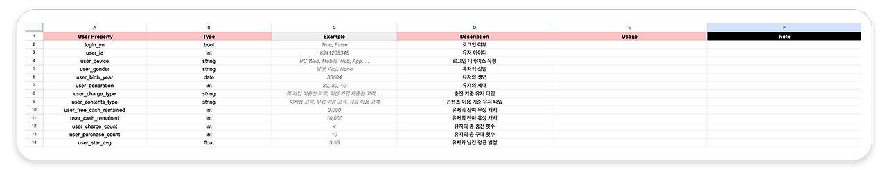 이전 글에서 언급했듯 이벤트 택소노미를 설계할 때는 마케팅 관점과 개발 관점을 별도로 이해하고 적용해야 합니다. 예를 들어, 마케터에게는 유저 플로우를 이해하는 데 초점을 맞춘 시각화된 자료(피그마 등)를 제공하되, 개발자에게는 데이터 로그를 이해하는 데 도움될 만한 정리된 자료를 제공합니다. 이때 시트의 유형은 이벤트 프로퍼티(Event Property)와 유저 프로퍼티(User Property) 두 가지로 분류됩니다.