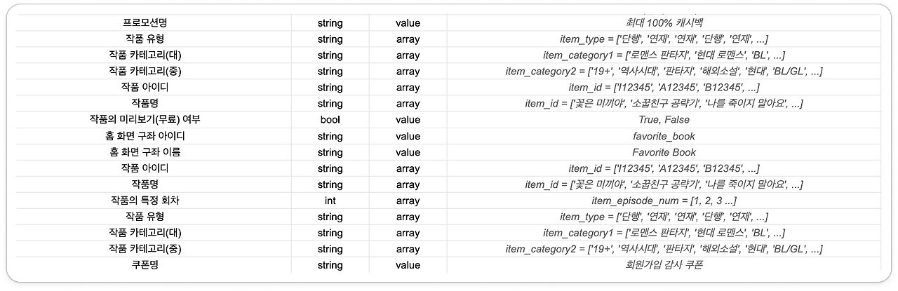 이때, 클릭(click) 또는 조회(page_view)와 같은 일반적인 이벤트 외에 모든 In-web/app 이벤트의 하위 속성으로 호출되는 사용자 속성(user property)이나, 특정 데이터 타입(data type), 혹은 자료 구조(data structure hierarchy)가 통일되지 않고 다양할 경우 택소노미 설계 시 별도로 명시해 주는 것이 좋습니다. (e.g. value 외 array 혹은 float 등 다양한 형태의 프로퍼티가 존재하는 경우)