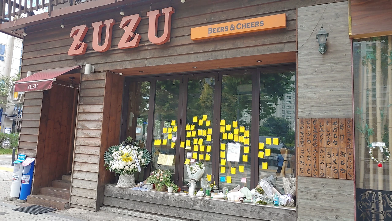 ZUZU라는 맥주, 일식 전문점이 있는데 문은 굳게 닫히고 유리창에 수많은 포스트잇 메모들만 빼곡하게 붙여져 있었다.