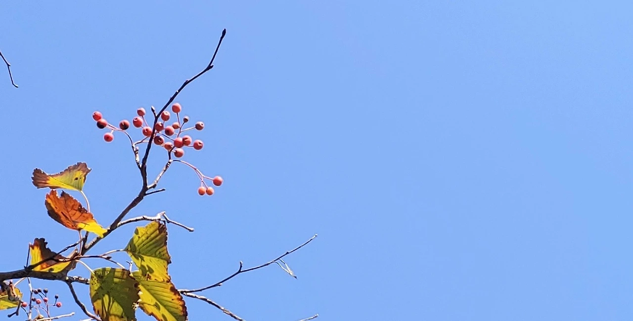 구기자 새빨간 열매를 까치들이 알뜰히 먹어치워 까치도 지 무게를 감당못하는 가느다란 가지에만 고스란히 열매가 남겨져있다.