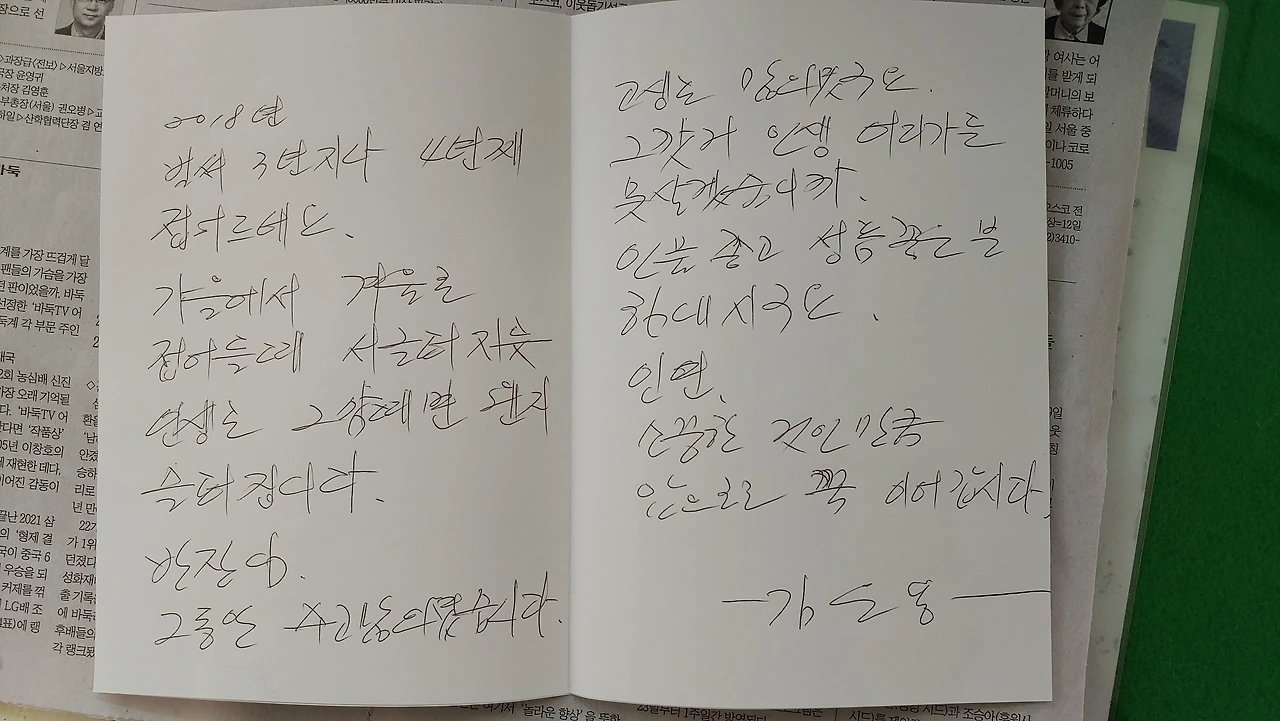 사무실 내 책상에 돌아와 A4용지를 두장꺼내 손편지를 썼습니다. 키보드로 타이핑해 인쇄하는게 더 편리하지만 손으로 쓰고 싶었습니다.