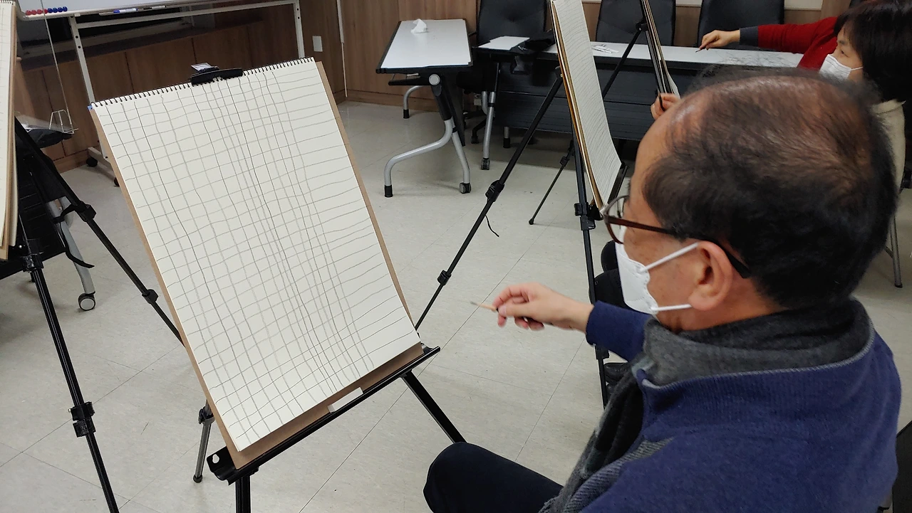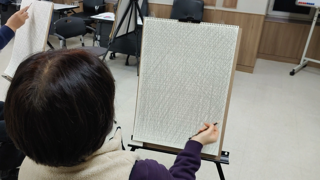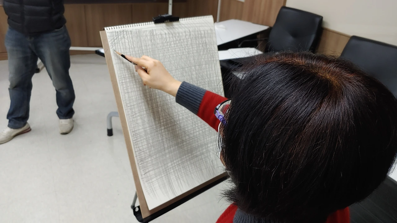 그림 그리는 기본지식을 10여분 말해주고는 선을 긋는 연습과 명암을 5단계로 구분해 칠하는 연습만