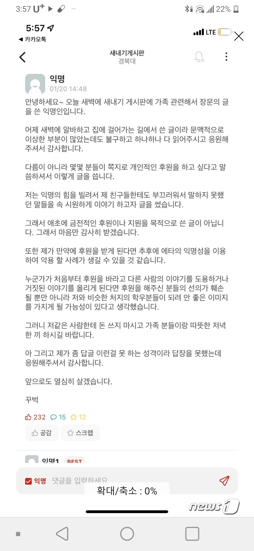 익명의 글이 온라인커뮤니티에 올려지고 난 후 포털뉴스에 알려져 많은 사람들이 감동을 하고 격려를 하는 한편 쪽지를 보내 도움을 주겠다고 했습니다.