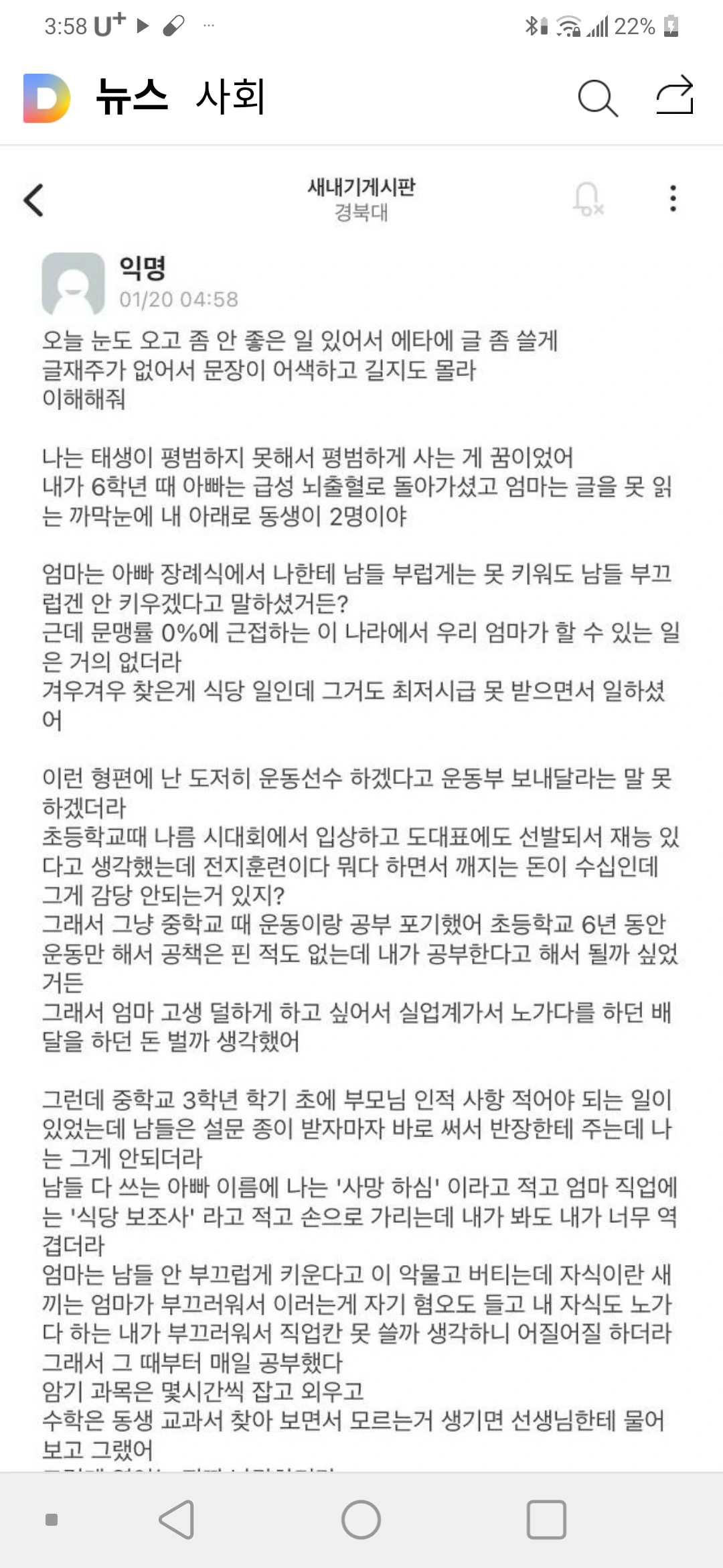 어느 대학생이 온라인커뮤니티에 익명으로 올린 글을 읽고 난 후 울림이 너무 커 잠이 안왔습니다.