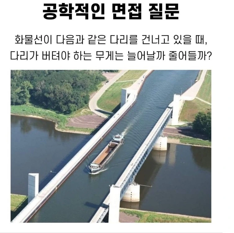 공학적인 면접 질문 - 화물선이 다음과 같은 다리를 건너고 있을 때, 다리가 버텨야 하는 무게는 늘어날까 줄어들까?