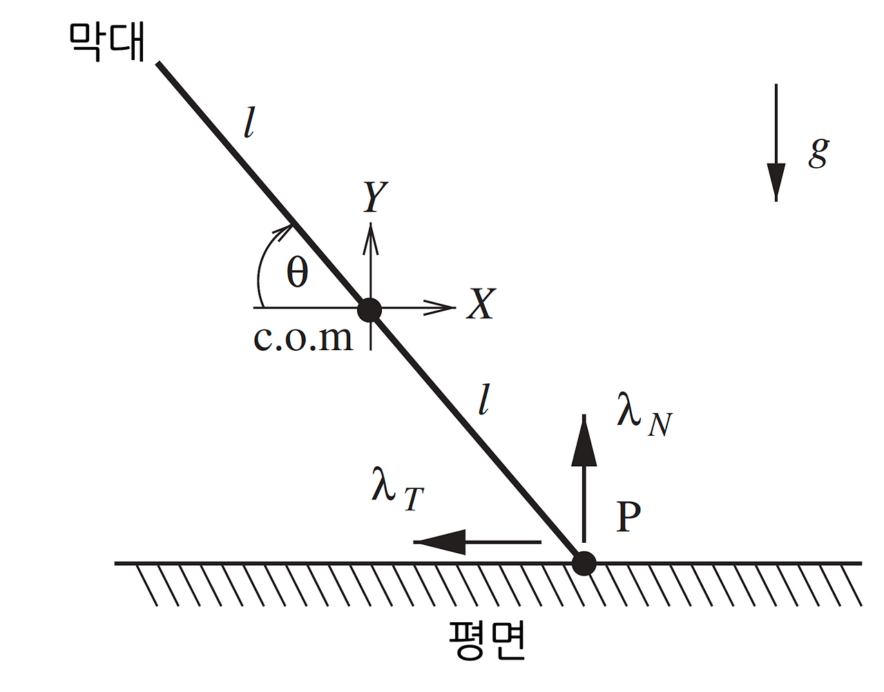 마찰력 개념의 한계는 분필 점프 현상을 이론적으로 분석할 때 역설을 만들어 내기도 합니다. 위의 그림처럼 평면 위에 막대가 있는데, 한쪽 끝이 면에 접해있고 일정한 힘을 받고 있는 시스템을 생각해 봅시다. 이때 막대가 면에 평행한 방향으로 아몽통-쿨롱 마찰 모델(Amontons-Coulomb friction model)*에 따른 마찰력을 받고, 마찰 계수가 충분히 높다고 가정합니다. 일정 시간이 지난 막대의 움직임을 시뮬레이션해보면 하나의 고유한(unique) 결과가 아닌 여러 가능성이 나오는 지점에 도달할 수 있는데요. 즉, 막대가 면에 접촉하거나 떨어지는 등 여러 경우의 수를 가질 수도 있고(부정; indeterminancy), 어떠한 움직임도 있을 수 없는 결과일 수 있습니다(불능; inconsistency)**. 따라서 막대가 다음에 어떻게 움직일지 알아낼 방법이 없는 것입니다. 이를 페인레브 역설(Painlevé paradox)이라고 합니다 [3]. 페인레브 역설은 마찰 계수가 4/3일 때 나타난다고 하는데, 일반적인 경우 마찰 계수가 1을 넘지 않는 것을 볼 때 매우 비현실적이라는 걸 알 수 있습니다.