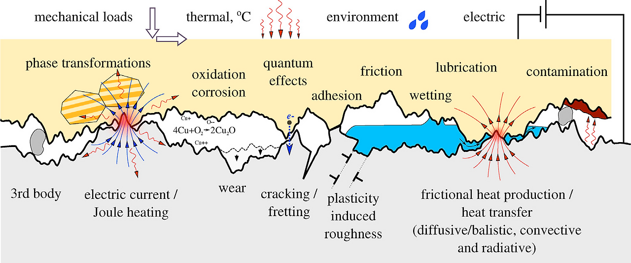 위 그림은 마찰을 일으키는 두 고체 표면 사이를 확대하여 나타낸 것입니다. 눈으로 보기에 매끈한 표면도 확대해서 보면 위 그림처럼 울퉁불퉁한 구조를 가지고 있습니다. 그래서 실제로는 두 표면에서 일부만 닿아 있고, 이것이 마찰을 일으킬 때 기계적, 열적, 전기적 현상 등 다양한 물리 현상들이 발생하는 것입니다.
