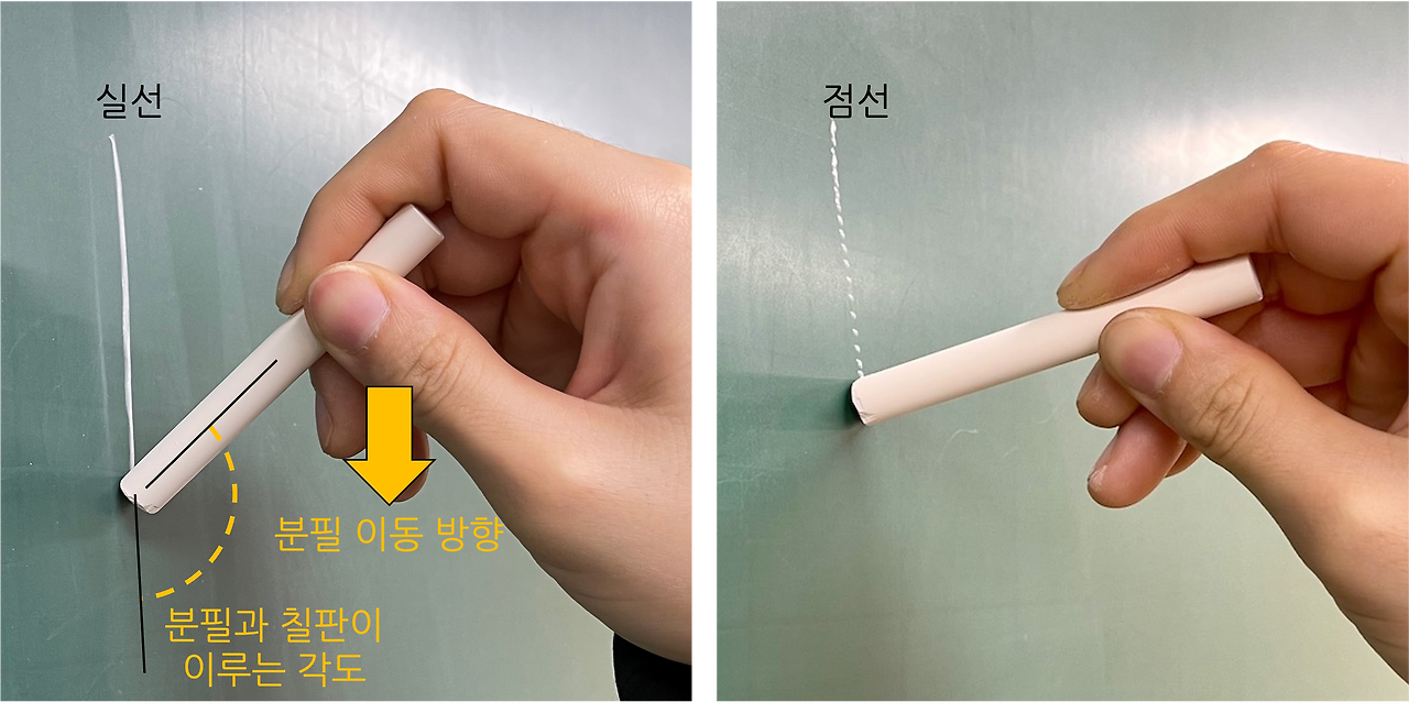 먼저 분필로 어떻게 점선을 그렸는지 떠올려 봅시다. 먼저 분필 끝을 가볍게 잡은 후 칠판에 수직이 되게 갖다 댑니다. 그리고 분필이 선을 그리는 방향으로 향하도록 살짝 기울여줍니다. 즉, 분필과 칠판이 이루는 각도가 둔각이 되게 합니다. 분필 각도를 일정하게 유지한 채 분필을 누르며 선을 그립니다. 이때 분필을 살짝 잡아서 분필이 약간 움직일 수 있게 해줍니다. 조건이 잘 맞으면 분필이 튀어오르는 움직임이 나타나는데, 분필이 다시 칠판에 닿을 수 있도록 칠판 방향으로 약하게 힘을 줍니다. 그러면 분필이 튀어 올랐다가 다시 칠판에 닿는 움직임을 반복하는데, 이것이 짧은 주기로 반복되면 드르륵 소리와 함께 점선이 그려집니다. 이런 현상을 분필 호핑(chalk hopping)이라고 합니다. 이 글에서는 쉽게 분필 점프라고 부르겠습니다.