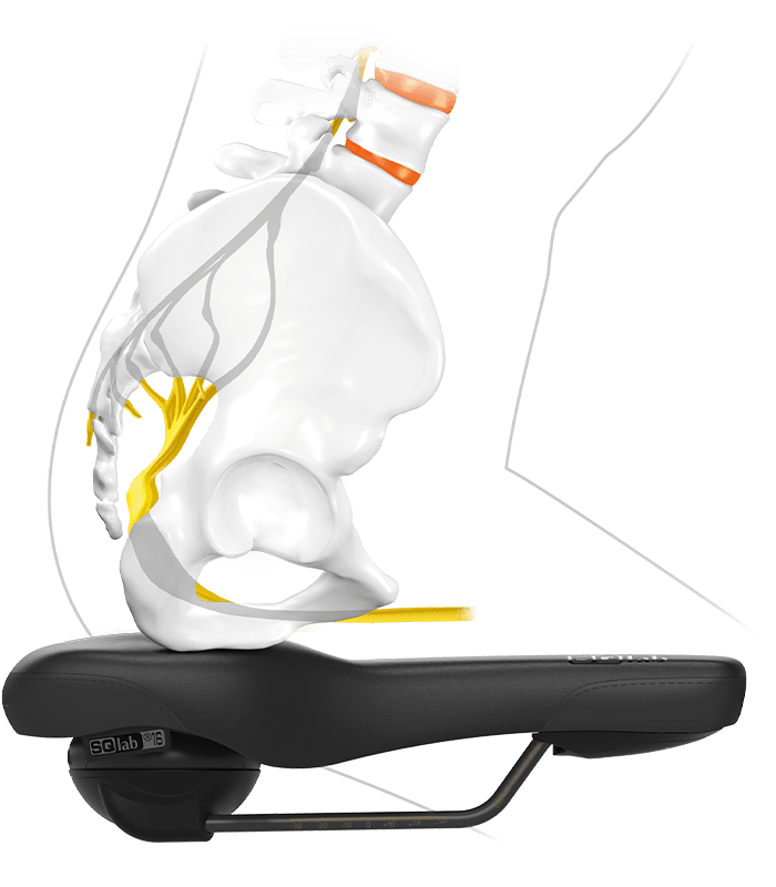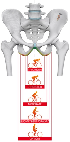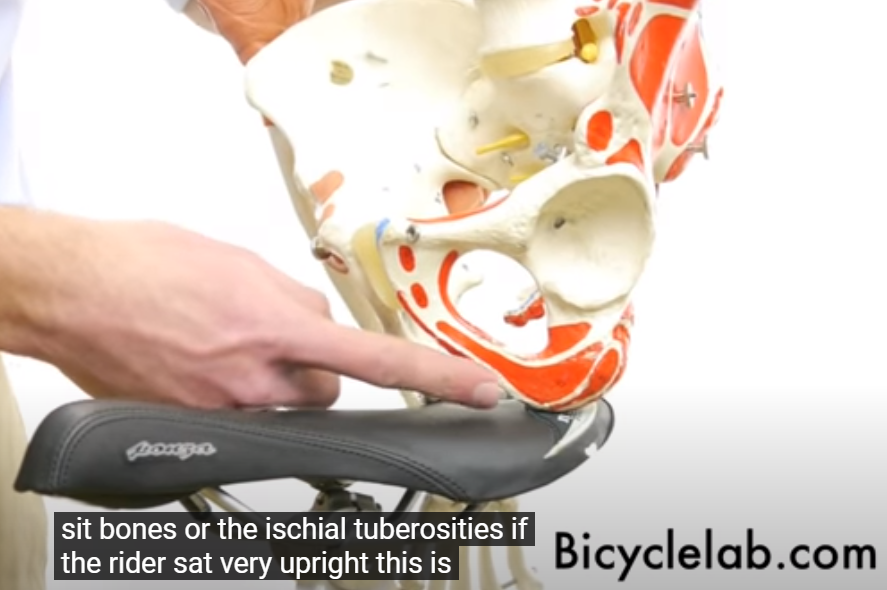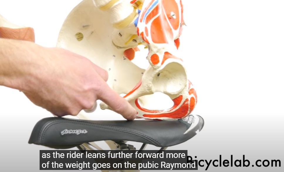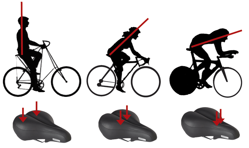 좀더 빠른 주행을 위해 몸을 앞쪽으로 숙이면 골반 중앙의 치골결합과 궁둥뼈(좌골) 사이의 두덩뼈(치골)가 안장에 닿으면서 압력이 분산됩니다. 그리고 앞으로 더 숙일수록 압력은 중앙 회음부(central perineal area)에 가까워집니다. 단, 체중을 분산시키기 위해 안장은 중앙뿐만 아니라 두덩뼈(치골)도 지지해주어야 합니다. 따라서 골반의 구조를 고려한다면 안장은 정면에서 볼 때 ㅅ자 모양, 즉 굴곡이 있어야 합니다.