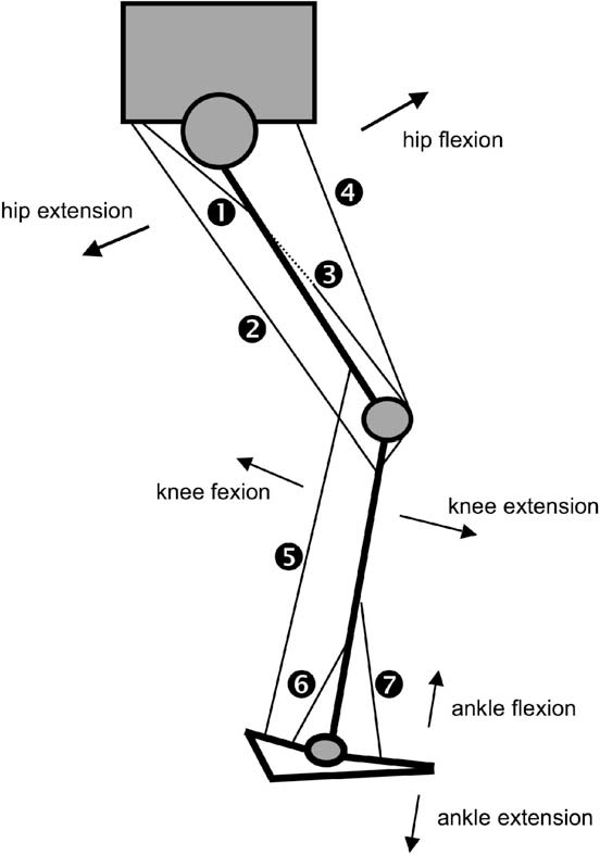 왼쪽 그림: 페달링과 관련된 주요 하지 근육 개략도: (1) GMax 엉덩관절 폄근(hip extensor); (2) SM 엉덩관절 폄근 및 무릎관절 굽힘근(hip extensors/knee flexors); (3) VM/VL 무릎관절 폄근(knee extensors); (4) RF 무릎관절 폄근 및 엉덩관절 굽힘근(knee extensor/hip flexor); (5) GL/GM 무릎관절 굽힘근 및 발목관절 폄근(knee flexors/ankle extensors); (6) SOL 발목관절 폄근(ankle extensor); (7) TA 발목관절 굽힘근(ankle flexor). [Hug & Dorel (2009)]