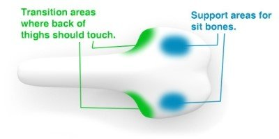안장에 앉을 때는 안장의 넓은 부분(아래 그림의 파란 영역에 해당)에 궁둥뼈(좌골)가 닿도록 해야 합니다. 이렇게 앉으면 궁둥뼈(좌골)가 상체 하중을 지지하게 됩니다. 그리고 안장 코(앞쪽)는 뾰족하게 만들어 페달링을 할 때 다리(허벅지)의 움직임에 방해되지 않도록 합니다. 다만 궁둥뼈(좌골)가 닿는 부위 근처(아래 그림의 녹색 영역에 해당)에는 허벅지가 닿습니다.