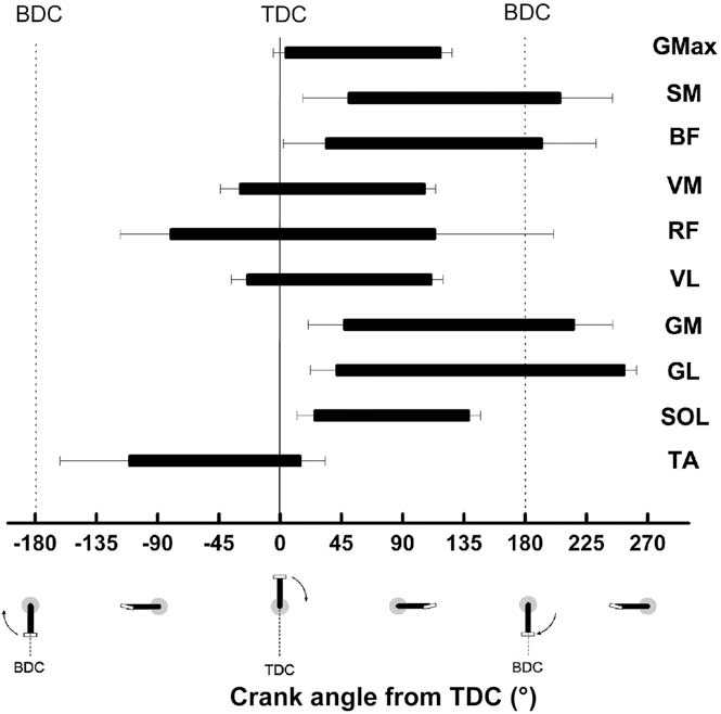 오른쪽 그림: 12명의 트라이애슬론 선수로부터 얻은10개의 하지 근육에 대한 EMG(electromyograph; 근전도 검사) 활동 단계의 평균 시작, 오프셋 및 기간. [Hug & Dorel (2009)]