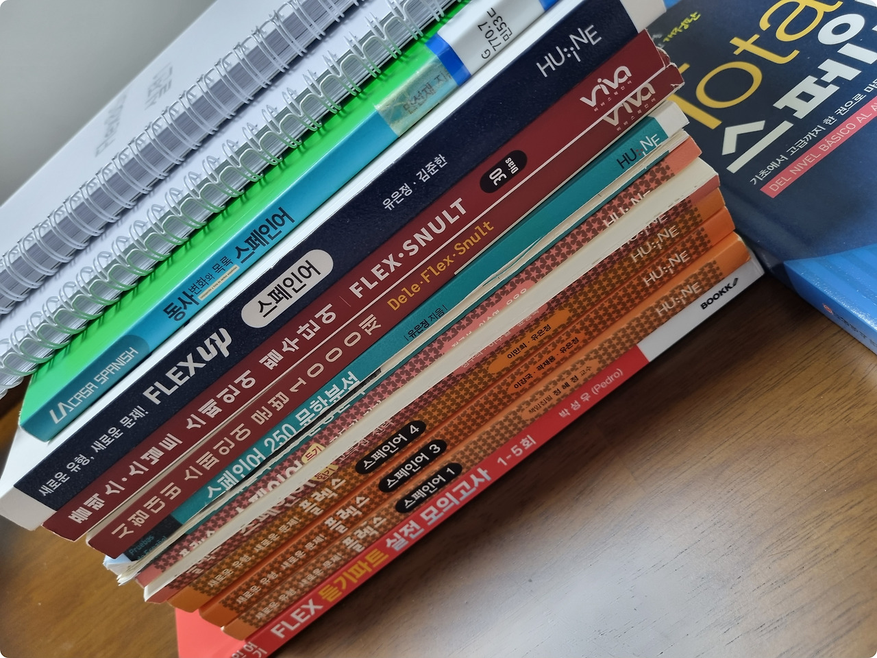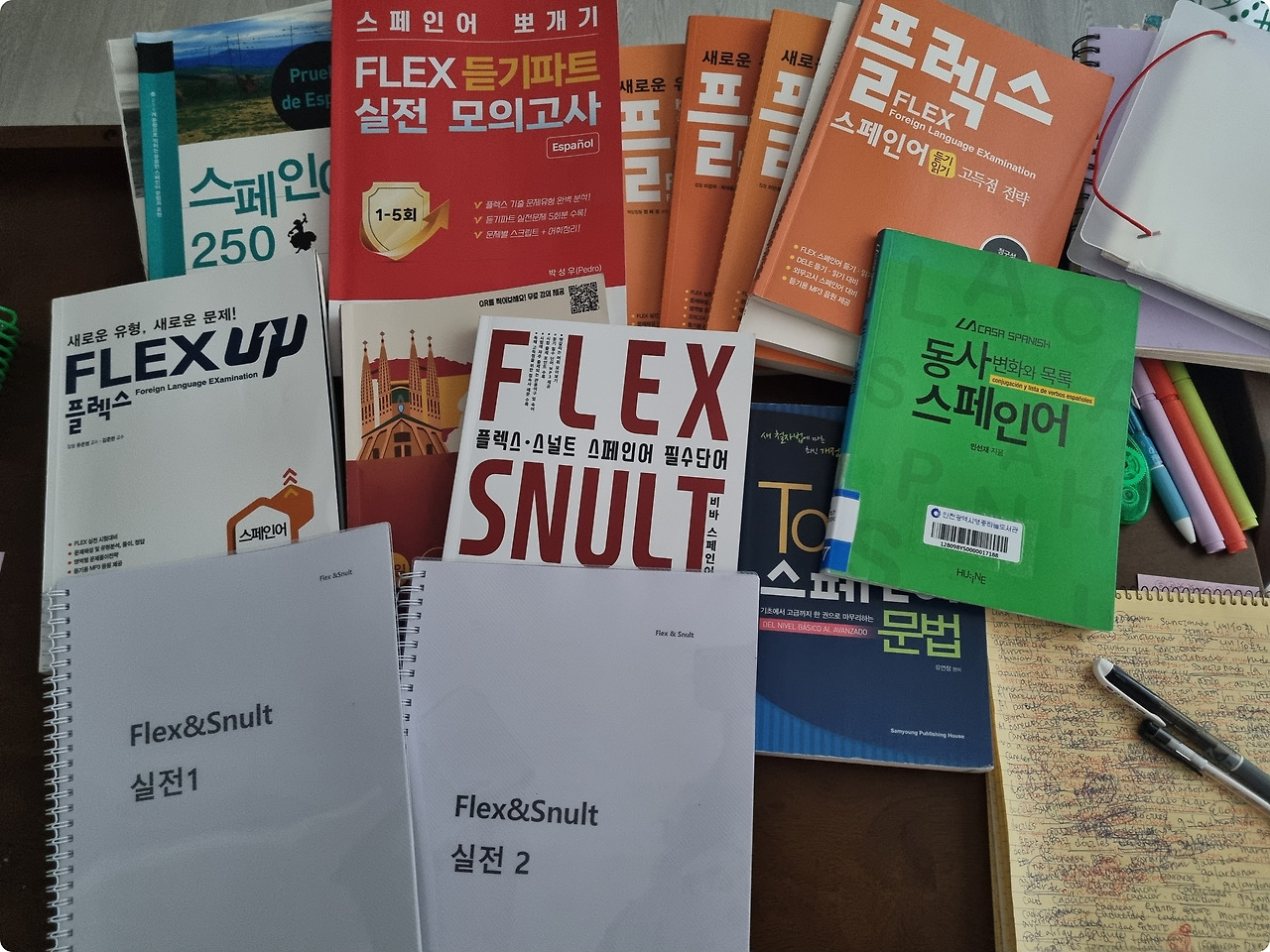일단 사진 속 책들이 '플렉스업' 교재를 시작으로 내가 이번에 플렉스 시험공부를 하면서 봤던 책들이다(여기다 전자책으로 '플렉스 스페인어 뽀개기'도 봤는데, 이동하거나 책을 보기 어려운 상황일 때 이용하려고 전자책으로 구매한 것이었지만 공부는 역시 종이책으로 해야 하는 것 같다).