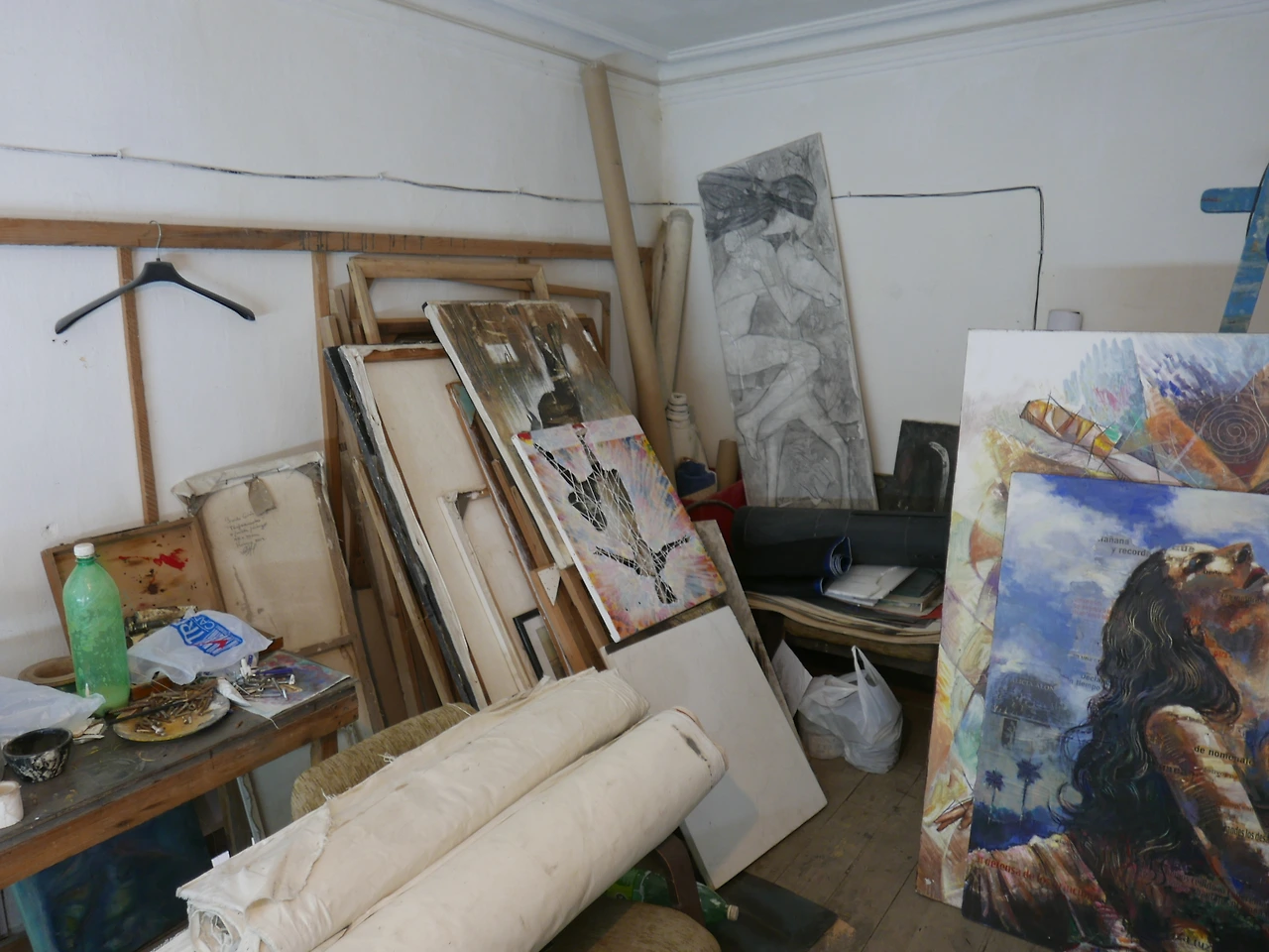 관광객들에게 유명한 오비스포 거리에서 파는 기념품용 그림과는 달랐다. 눈을 사로잡는 원색이나 클래식 카, 춤추는 남녀, 쿠바 국기나 체 게바라 대신 이집트 벽화가 생각나던 평면적인 그림, 깨진 거울에 비친 것 같이 파편화된 발레리나, 커다란 천 위에 몸을 웅크린 댄서가 있었다. 개중엔 꼴라주도 있었다. 책이나 신문지를 붙였는지 알파벳도 보였다.
