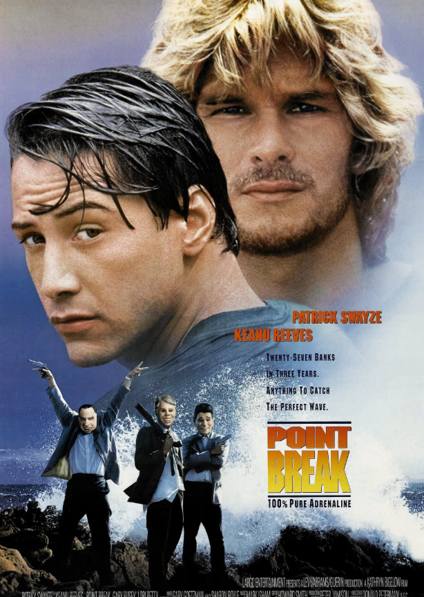 잠입 수사라는 익숙한 틀에 서핑, 은행 강도, 극한 스포츠를 결합해 지금 봐도 속도감과 긴장감이 살아 있습니다. <분노의 질주 Fast andFurious, 2001>도 비슷한 설정이지요. 빈 디젤, 폴 워커가 매력적인 것처럼 이 영화에서도 무엇보다 키아누 리브스, 패트릭 스웨이지가 맡은 두 캐릭터에게 빨려 들어가지요.
