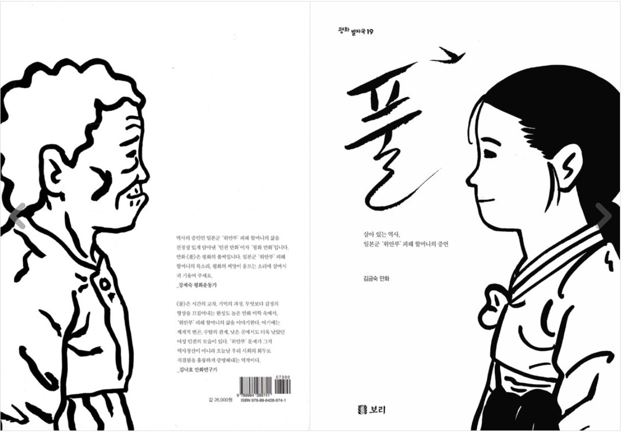 한국의 일제강점기, 학교에 가고 싶었던 소녀는 일본군의 성노예가 되었다. 수많은 고비를 넘기며 살아남은 소녀는 뉴스 속에서 일본에게 당당히 사과를 요구하는 당찬 이옥선 할머니이다. 만화 <풀>은 이옥선 할머니의 삶을 다룬 만화로, 다수의 세계 유명 매체에서 최고의 그래픽 노블로 선정했고 2020년에는 만화의 오스카로 비유되는 미국의 하비상을 받았다. 프랑스어와 영어를 비롯해 12개 언어로 번역 출간되었다.