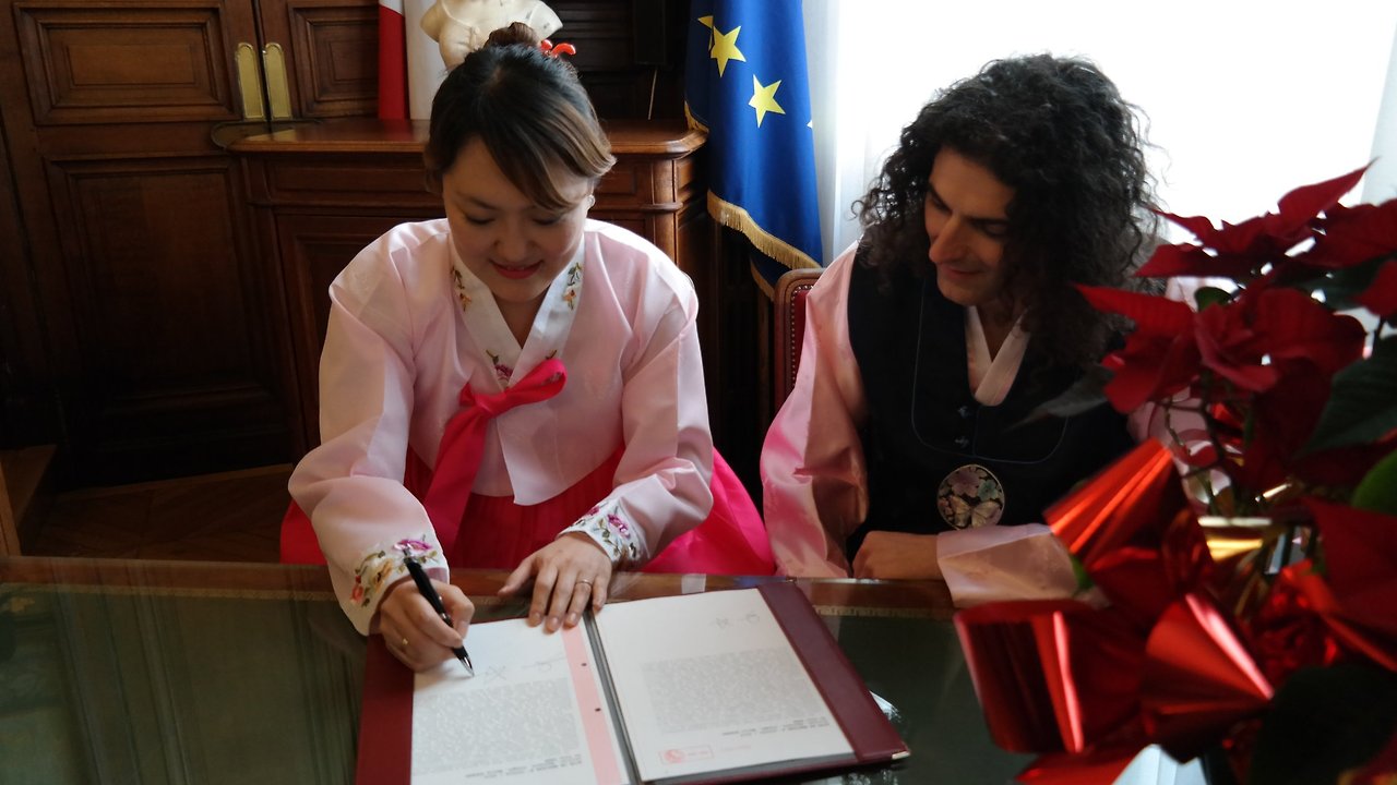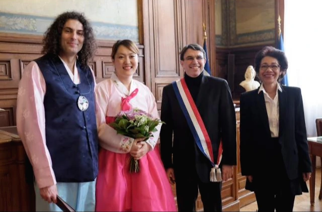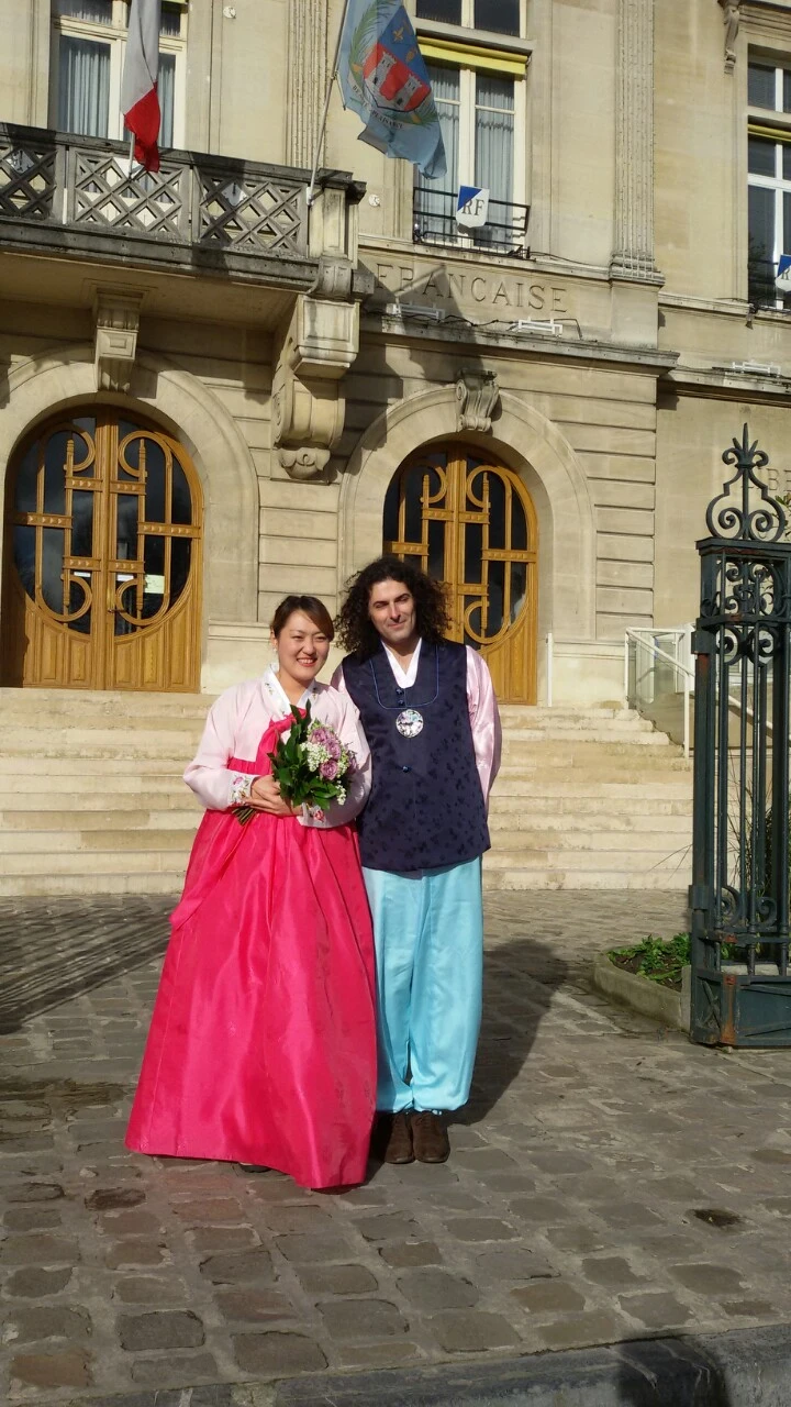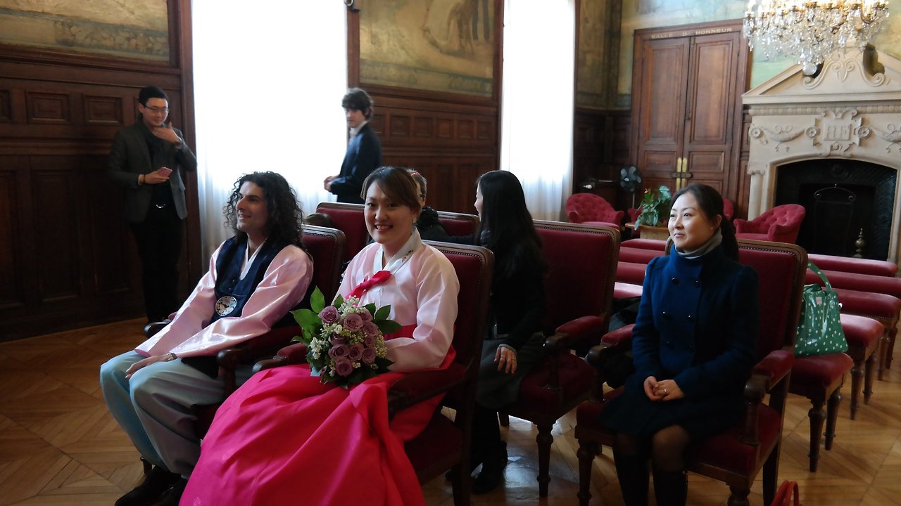 2014년 8월 31일 한국에서 결혼식을 올린 우리는 다시 5개월이 지난 2015년 1월 31일 프랑스에서 두 번째 결혼식을 올렸다. 나는 한불 커플인 이라와 엠마뉴엘, 용휘와 엠마뉴엘 두 부부에게 증인을 부탁했고 오후 2시 시청에 도착 곧바로 예식이 진행되었다. 이미 한번 해서 그런지 별로 설레지는 않았지만^^ 둘 다 한복을 차려입고 막상 시청의 결혼식 공간 안으로 들어가니 조금은 떨리기도 했다. 결혼식 담당자들은 결혼에 대한 간단한 법 조항을 읽어주고 서로 신랑 신부로 받아들이겠냐고 물었다. ‘OUI(네)’라고 대답을 하고 반지를 주고받으니 결혼식은 끝났다. 결혼식은 매우 짧았다. 그렇게 대답을 마친 후에는 결혼식 서류에 나와 올리비에, 증인들이 사인을 했다. 프랑스의 결혼은 반드시 시청에서 해야 하고 예식은 짧게 진행되지만, 프랑스 결혼식의 꽃이자 정점은 피로연이다.
