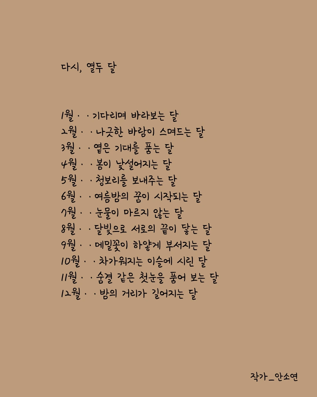 작가 안소연 입니다. 살아가는 길목마다 피어나는 무거우면서 가볍기도 한 고민들을 함께 공감하며 위로해주고 싶습니다. 이 글들이 당신의 손에 그리고 당신의 마음 깊이 닿기를...