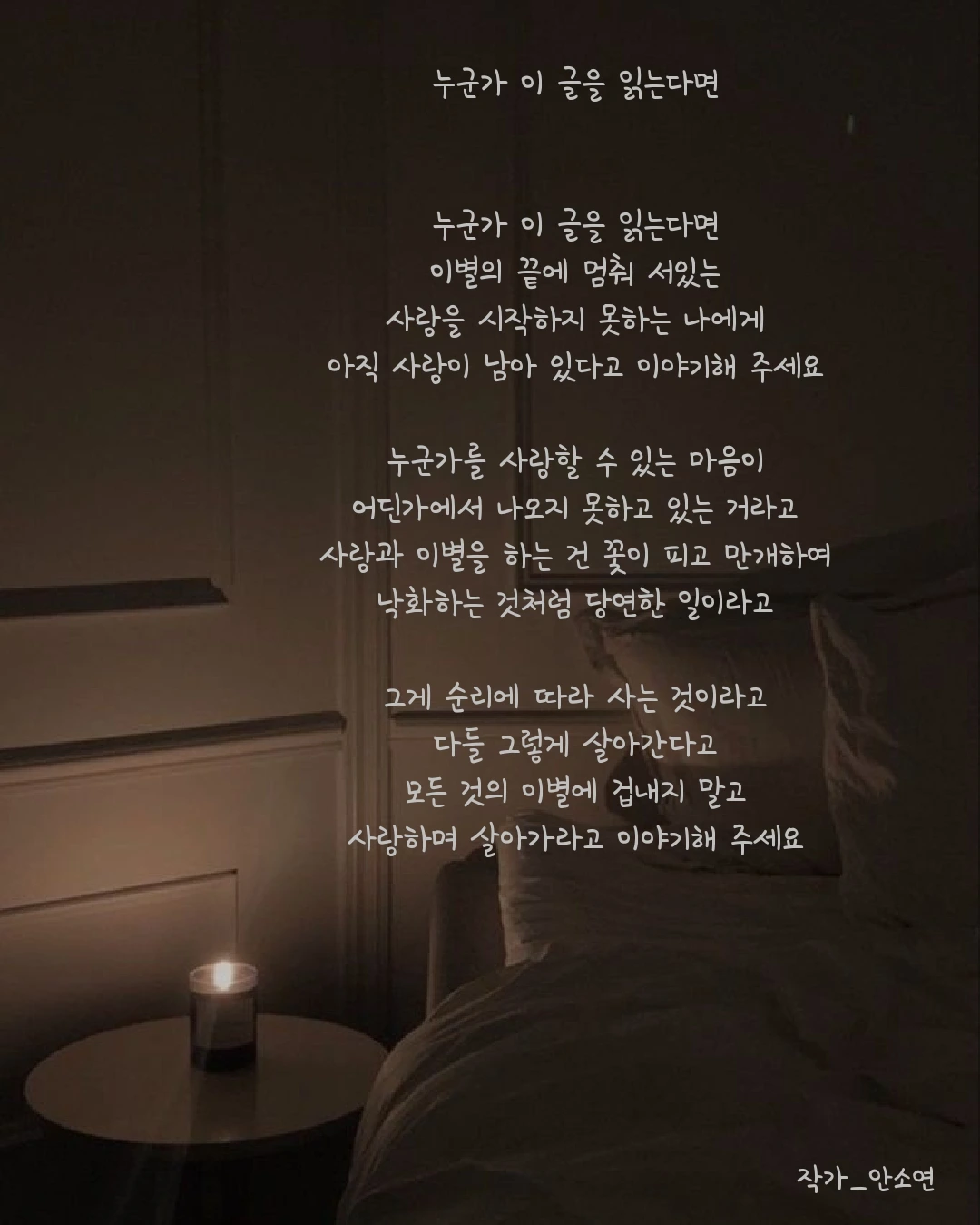 작가 안소연 입니다. 살아가는 길목마다 피어나는 무거우면서 가볍기도 한 고민들을 함께 공감하며 위로해주고 싶습니다. 이 글들이 당신의 손에 그리고 당신의 마음 깊이 닿기를...