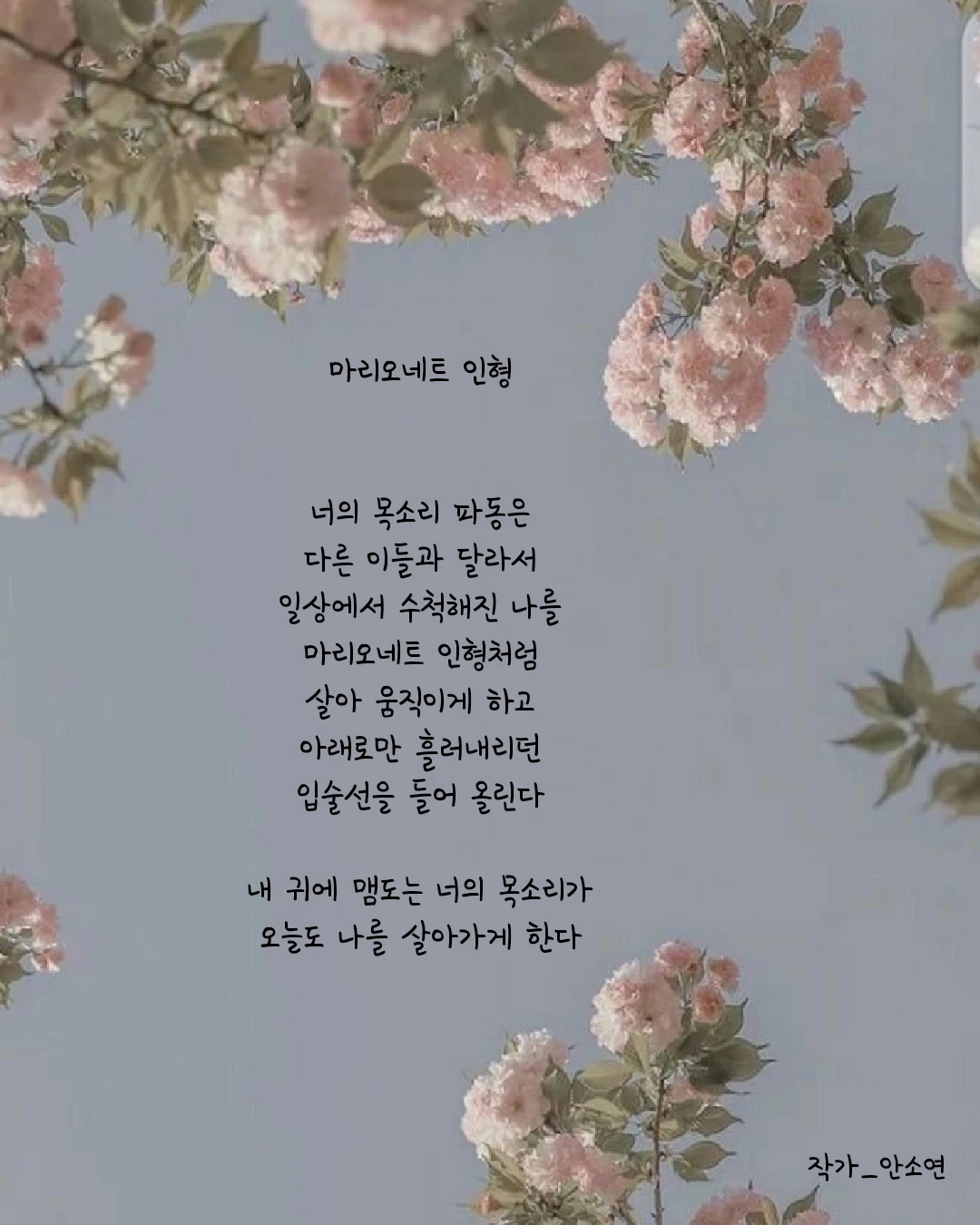 작가 안소연 입니다. 살아가는 길목마다 피어나는 무거우면서 가볍기도 한 고민들을 함께 공감하며 위로해주고 싶습니다. 이 글들이 당신의 손에 그리고 당신의 마음 깊이 닿기를...