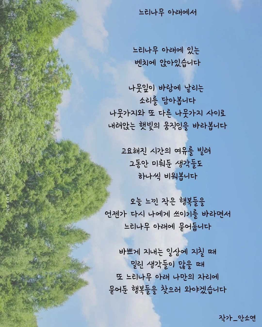 작가 안소연 입니다. 살아가는 길목마다 피어나는 무거우면서 가볍기도 한 고민들을 함께 공감하며 위로해주고 싶습니다. 이 글들이 당신의 손에 그리고 당신의 마음 깊이 닿기를...