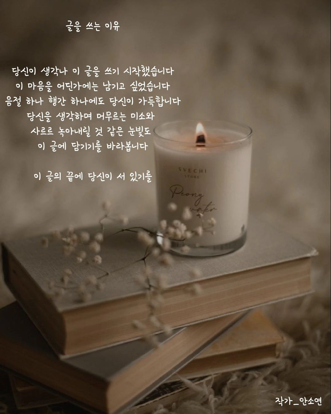 작가 안소연 입니다. 살아가는 길목마다 피어나는 무거우면서 가볍기도 한 고민들을 함께 공감하며 위로해주고 싶습니다. 이 글들이 당신의 손에 그리고 당신의 마음 깊이 닿기를...