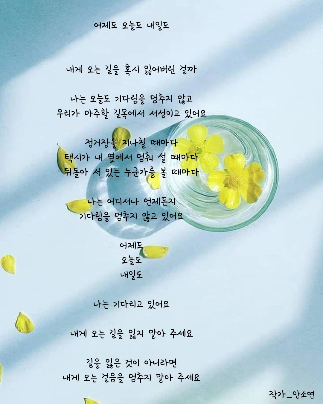 작가 안소연 입니다. 살아가는 길목마다 피어나는 무거우면서 가볍기도 한 고민들을 함께 공감하며 위로해주고 싶습니다. 이 글들이 당신의 손에 그리고 당신의 마음 깊이 닿기를...