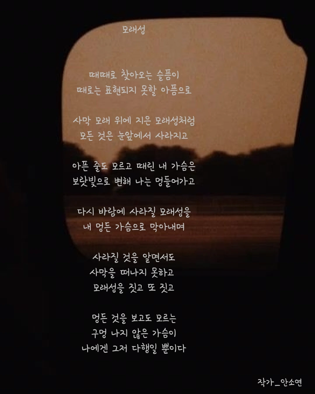 작가 안소연 입니다. 살아가는 길목마다 피어나는 무거우면서 가볍기도 한 고민들을 함께 공감하며 위로해주고 싶습니다. 이 글들이 당신의 손에 그리고 당신의 마음 깊이 닿기를...
