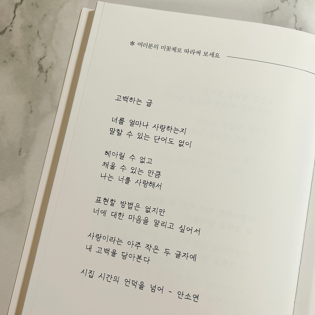 더욱 정교하고 깔끔해진 글씨는 이제 인쇄된 폰트처럼이 아닌 인쇄된 폰트보다 아름다운 글씨라고 불러도 전혀 손색이 없을 정도다. 여기에 독자들이 글씨를 쓸 때 잉크의 번짐을 최소화할 수 있도록 고급용지를 사용하였고, 책이 180도 펼쳐질 수 있도록 실을 사용한 누드제본을 택했다. 그리고 필사의 난이도 조정이 가능하도록 글자의 농도를 조절하여 진한 글자 따라 쓰기에서 차츰 옅은 글자를 따라 쓸 수 있도록 했다.