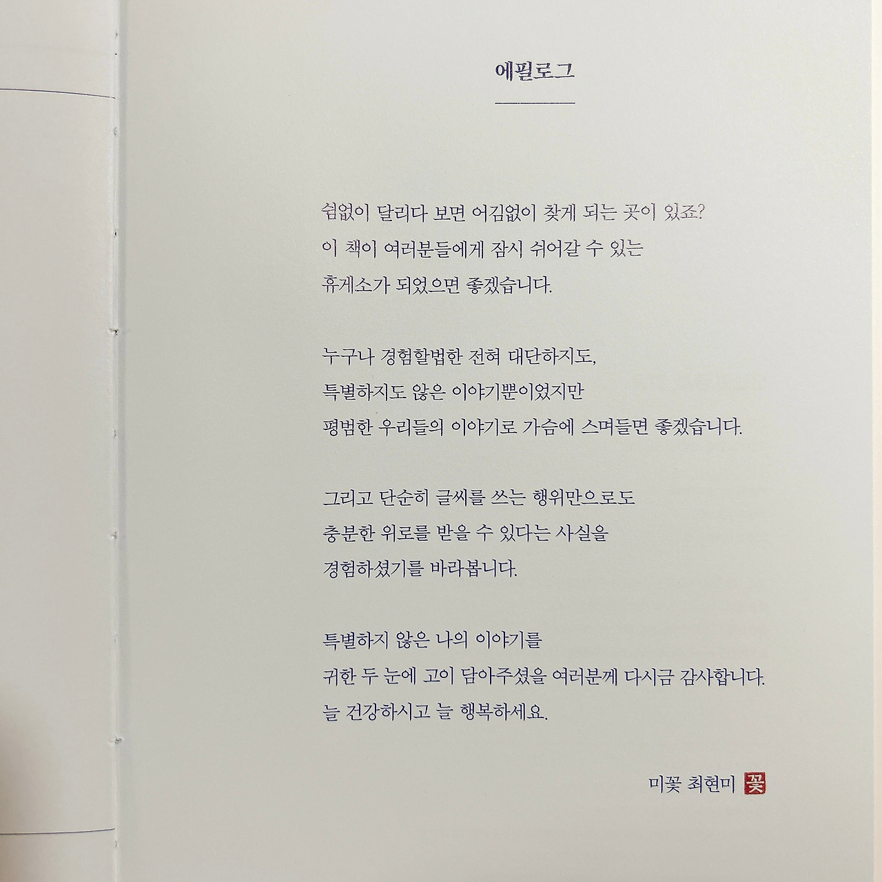 산후우울증에 시달리던 고달픈 엄마의 삶이 미꽃체를 쓰면서 치유되고 인생이 바뀐 자신처럼 이제는 더 많은 사람이 자신과 같은 삶의 변화를 느끼게 해주겠다는 마음으로 쓴 책이다.