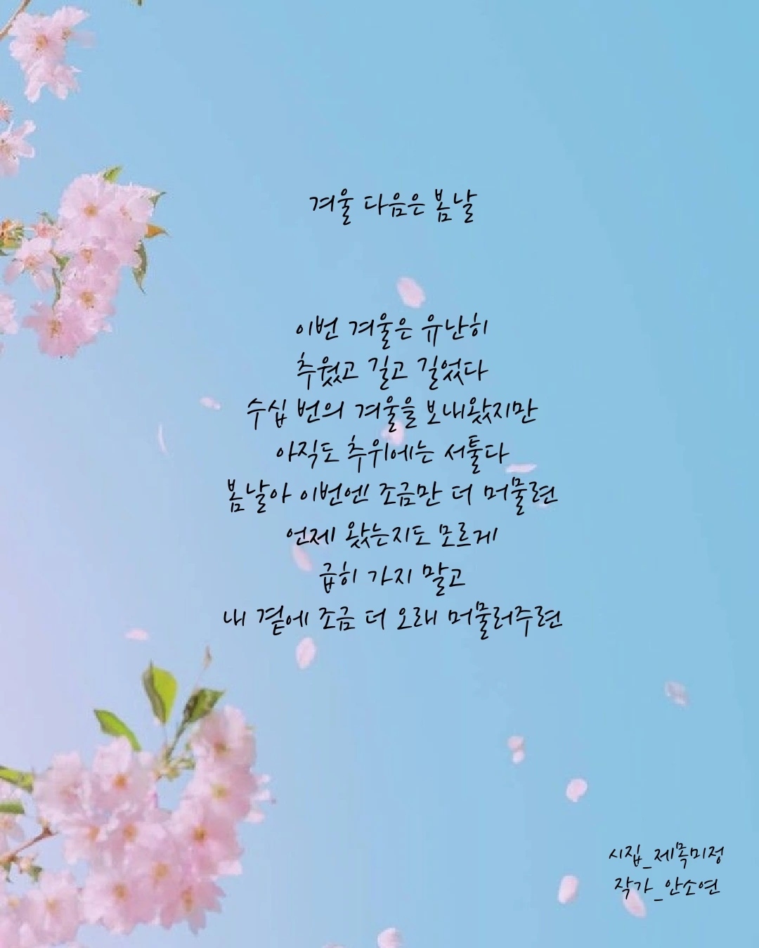 작가 안소연 입니다. 살아가는 길목마다 피어나는 무거우면서 가볍기도 한 고민들을 함께 공감하며 위로해주고 싶습니다. 이 글들이 당신의 손에 그리고 당신의 마음 깊이 닿기를...