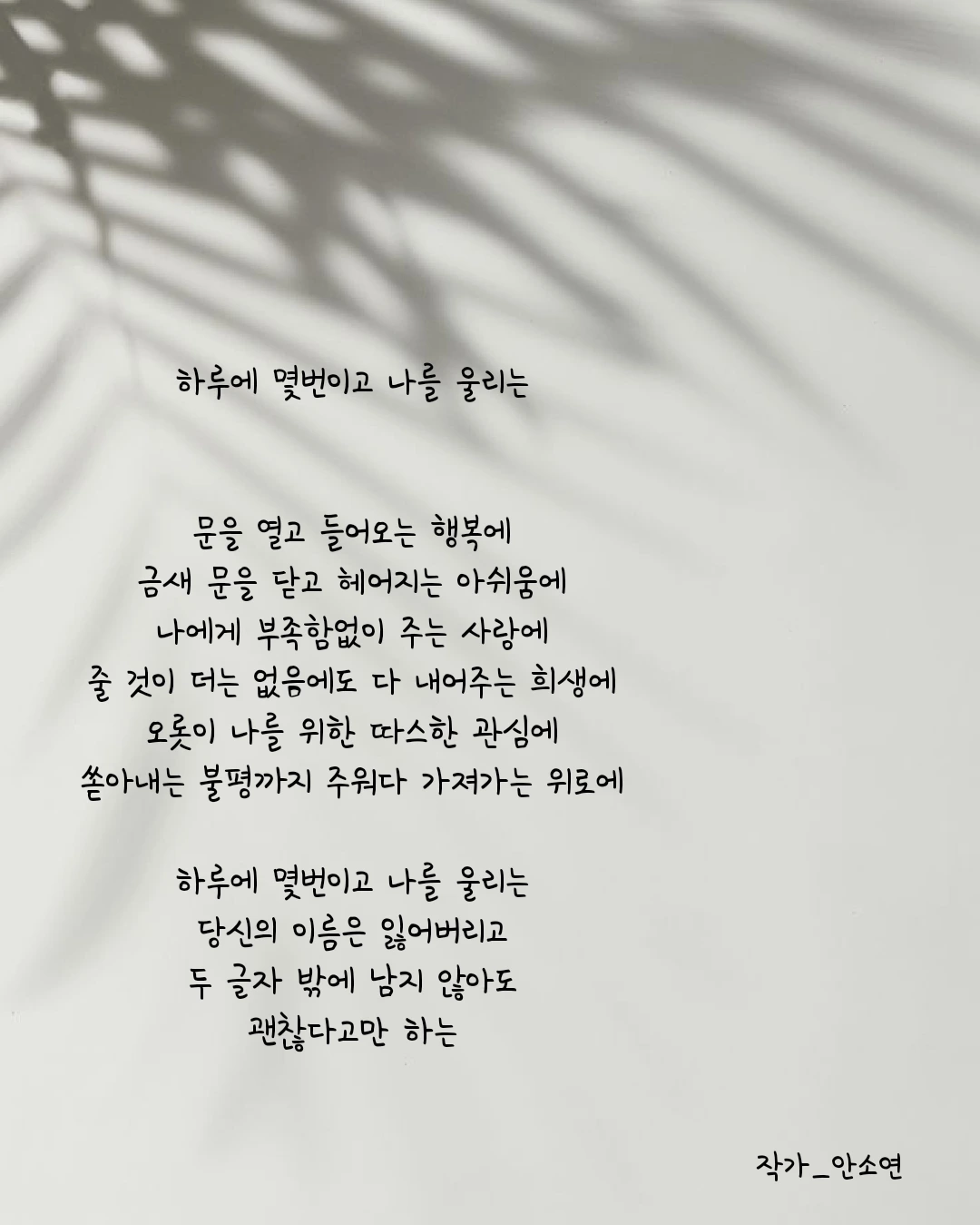 작가 안소연 입니다. 살아가는 길목마다 피어나는 무거우면서 가볍기도 한 고민들을 함께 공감하며 위로해주고 싶습니다. 이 글들이 당신의 손에 그리고 당신의 마음 깊이 닿기를...