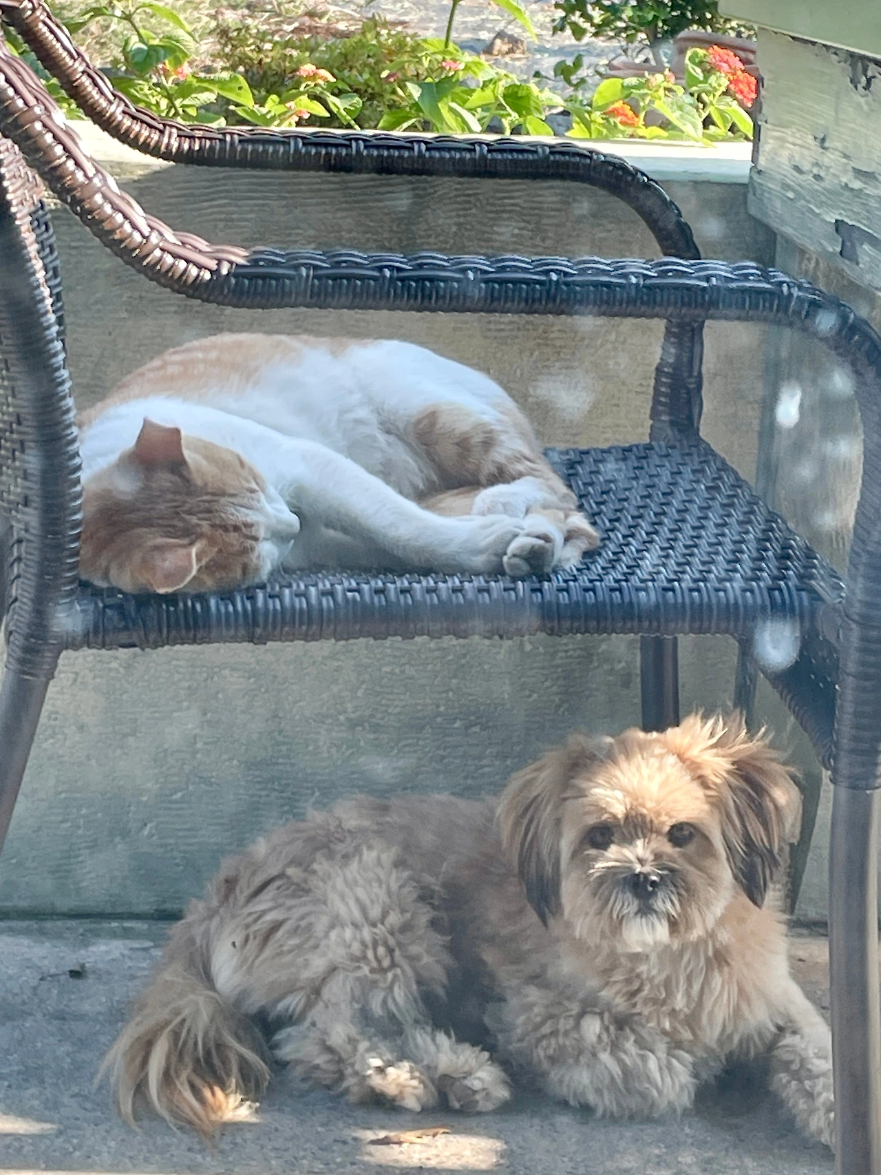비가 오던 날이었다. 모두 점심을 먹다 테라스로 눈을 돌렸다. 정원이와 꼬질이는 틈만 나면 둘도 없는 앙숙인 것처럼 굴더니 처마 밑에 나란히 앉아 비를 피하고 있었다. 아무도 모르는 사이에 가까워진 것은 나뿐만이 아니었다. 개와 고양이의 조합이라니. 그 둘은 으르렁거리지도 않고 비가 그칠 때까지 그렇게 조용히 앉아만 있었다.