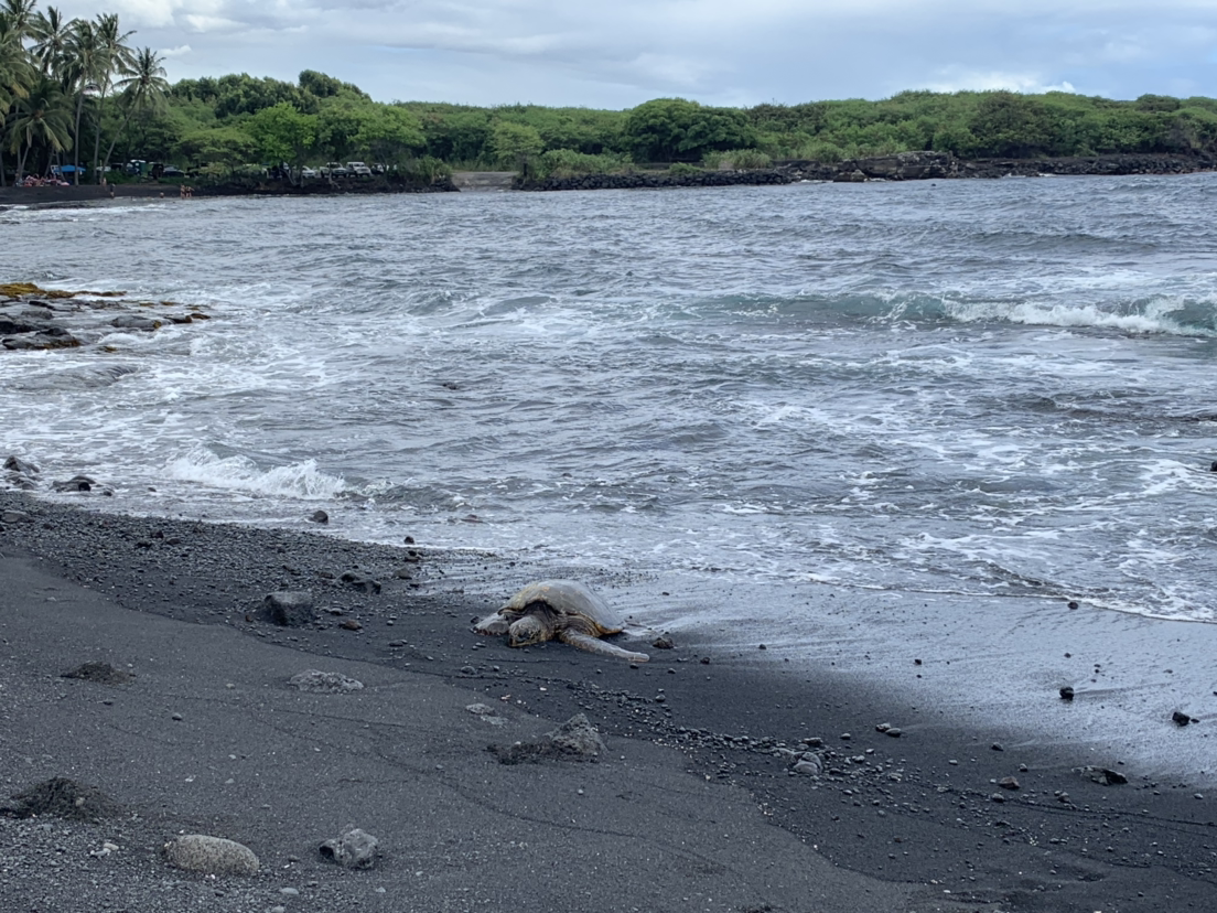 # 모래가 검은 푸날루우 해변에서는 거북이를 볼 수 있음.
