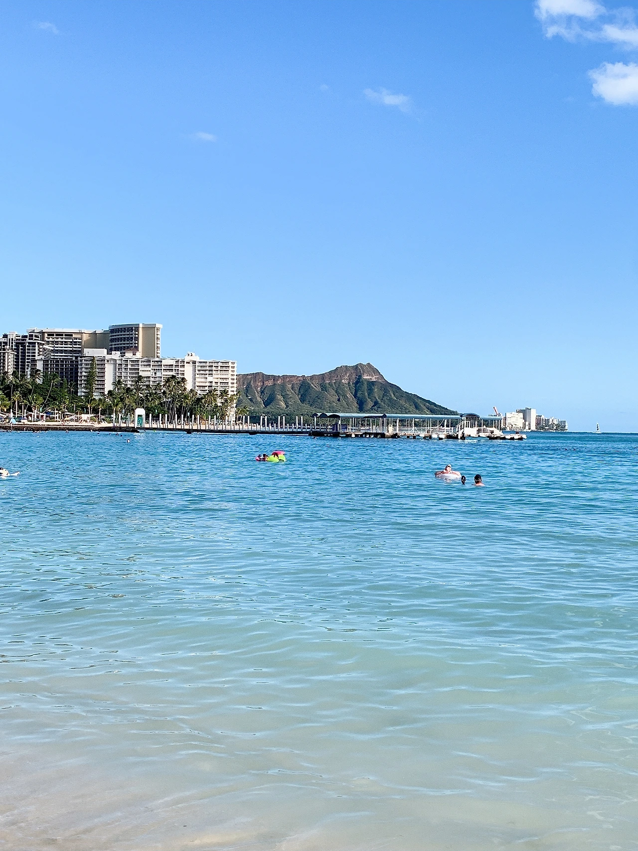 # 와이키키 해변은 수심이 얕아 수영을 못하는 초보자에게도 열려있으며, 비치타월과 매트 (없으면 ABC스토에서 쉽게 구매)만 가지고 가면 누구나 이용이 가능함.