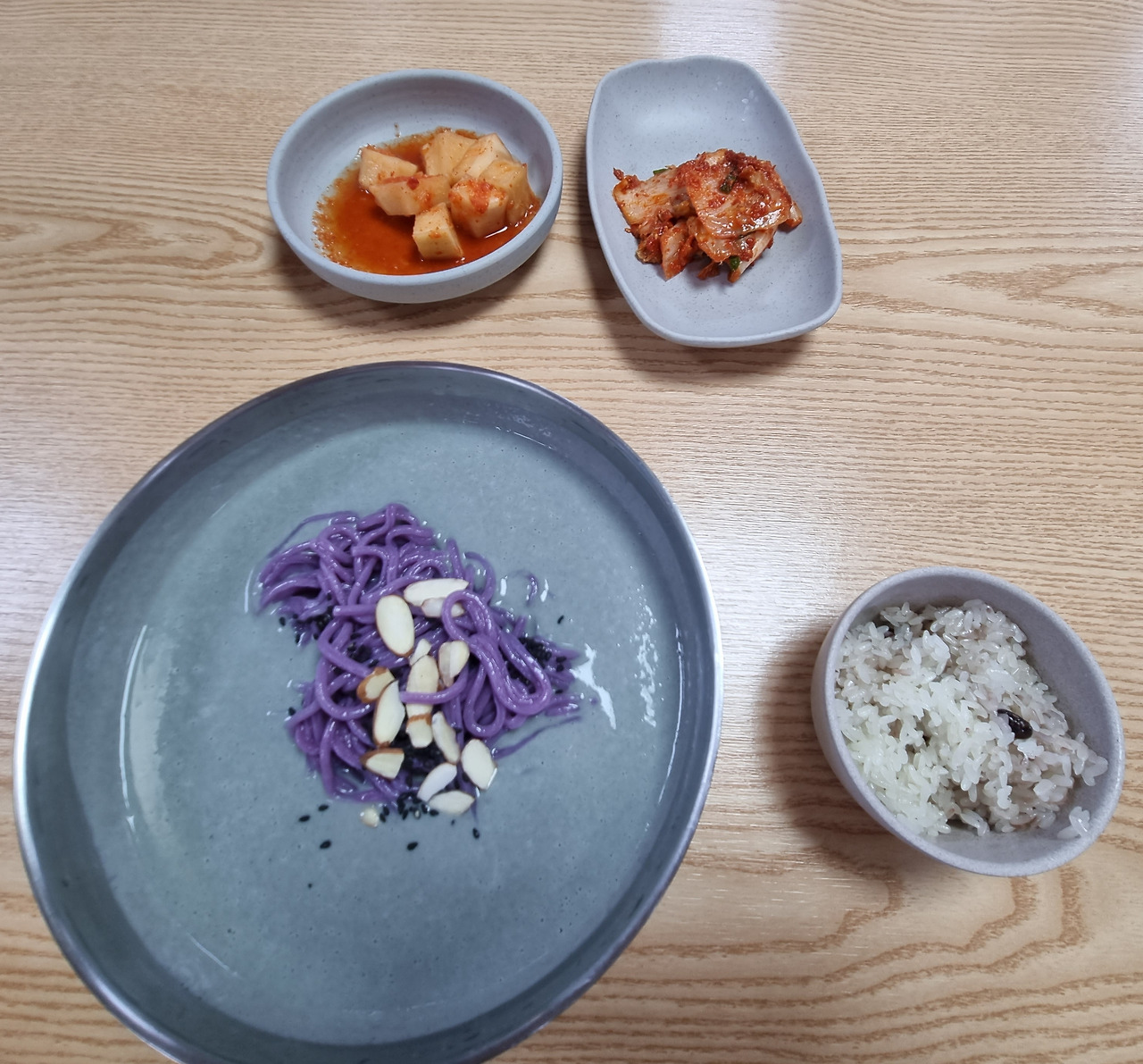-토핑 : 슬라이스 아몬드와 검은 깨. 콩국수와 조화롭다