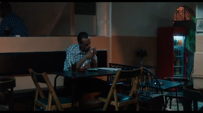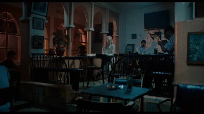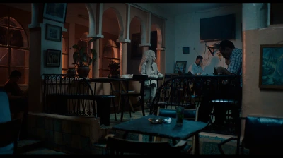 아무튼 이 역설적 상황에 대한 대응에서 아담과 이브가 갈라진다. 그걸 확인하기 위해 우린 다시 한 번 회전하는 화면으로 돌아가야 한다(이 글의 운동성 또한 회전이다). 시계 방향과 반시계 방향 사이에서 오락가락하는 회전이 끝나는 순간 아담과 이브가 각자의 집에서 눈을 뜬다. 이후 두 사람의 행동은 비슷하지만 명백한 차이를 보인다. 우선 둘 다 일어나 밖(세계)을 내다본다. 하지만 그 방식이 다르다. 아담은 CCTV화면을 확인한 다음 창을 가리고 있는 커튼을 살짝 들추고 밖을 본다. 그의 시선은 방어적이다. 반면 이브는 보다 적극적이다. 그녀는 테라스에 올라가 호기심 어린 시선으로 거리를 내려다본다. 이러한 차이는 그 다음 두 사람의 행동에서 보다 극명하게 드러난다. 이브는 자신의 호기심을 자극하는 세계로 나가지만 아담은 집을 떠나지 않는다. 그는 자신과 거래하는 인간인 이안을 집 안으로 들여서 그가 가져온 낡은 악기들을 만져보면서 세상을 떠난 음악가들을 떠올린다. 하지만 이브는 거리를 걸으면서, 그리고 카페에 앉아서 사람들의 행동을 흥미롭게 쳐다본다. (아래의 사진을 참고하라)