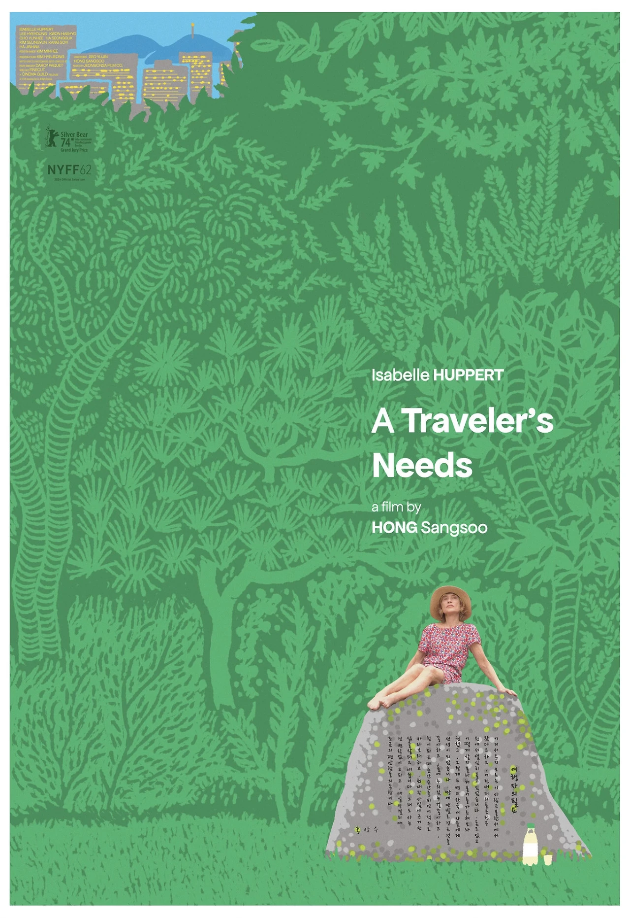 <여행자의 필요> 포스터에는 독특하게도, (위 포스터에는 이자벨 위페르가 앉아 있는 바위에, 메인 포스터에는 전면에 걸쳐) 영화의 시놉시스가 빠짐없이 적혀 있다. 먼저 그 글을 가져와본다.