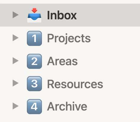 3. 정보를 1차로 압축하면서 분류를 해둔다. 어차피 분류에 정답은 없어 보였고, 뭐든 over-engineering 하다가 결과가 안좋았던 경우를 많이 알기에 일단 책에서 추천하는 'PARA' 분류법으로 시작하기로 했다. 이는 Projects, Areas, Resources, Archives 의 약자로 새로운 정보를 다음의 4가지 카테고리 중 하나에 넣는 방식이다.