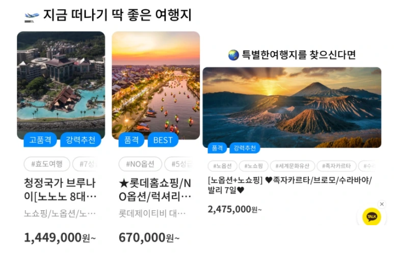 '지금 떠나기 좋은 여행지'와 '특별한 여행지' 같은 유사한 콘텐츠를 하나의 슬라이드로 통합해 정보의 중복을 줄이고, 시각적 집중도를 높였습니다.-> 탐색 효율을 향상