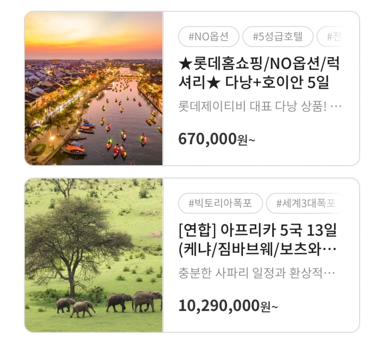 상품마다 제목, 설명, 태그, 아이콘 등 너무 많은 정보를 한 번에 노출시켜, 사용자는 오히려 핵심 정보를 찾기 어려워졌습니다. 예를 들어, "★롯데홈쇼핑/NO옵션/럭셔리★" 등은 실제 구매 결정에 도움이 되는 정보보다는 광고적이고 불필요한 요소로 작용했고 핵심인 "목적지", "일정" 같은 정보는 시각적으로 묻히는 문제가 있었습니다.