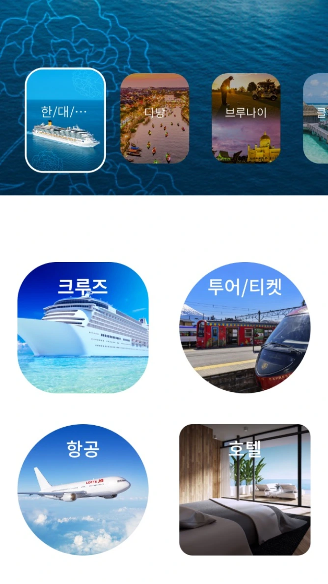 '크루즈', '호텔', '투어/티켓' 섹션 이미지가 사각형, 원형이 혼재되어 있어 시각적 통일감이 없었습니다. 이는 시선 분산을 유발해 사용자로 하여금 핵심 콘텐츠를 찾는 데 더 많은 노력을 요구하게 만들었습니다.